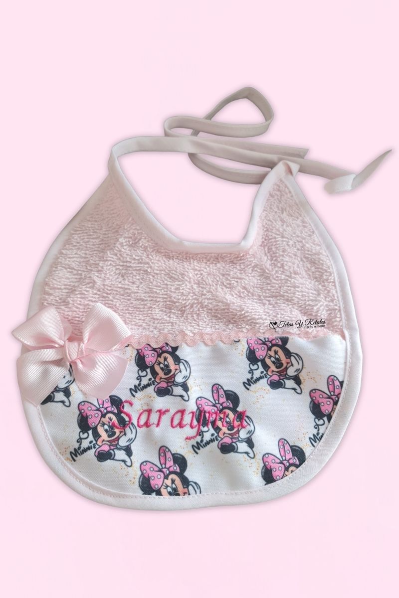 Nuevo babero de minnie mouse en color rosa. Puedes cambiar la tela y el color del babero. Personalízalo con el nombre de tu bebé.