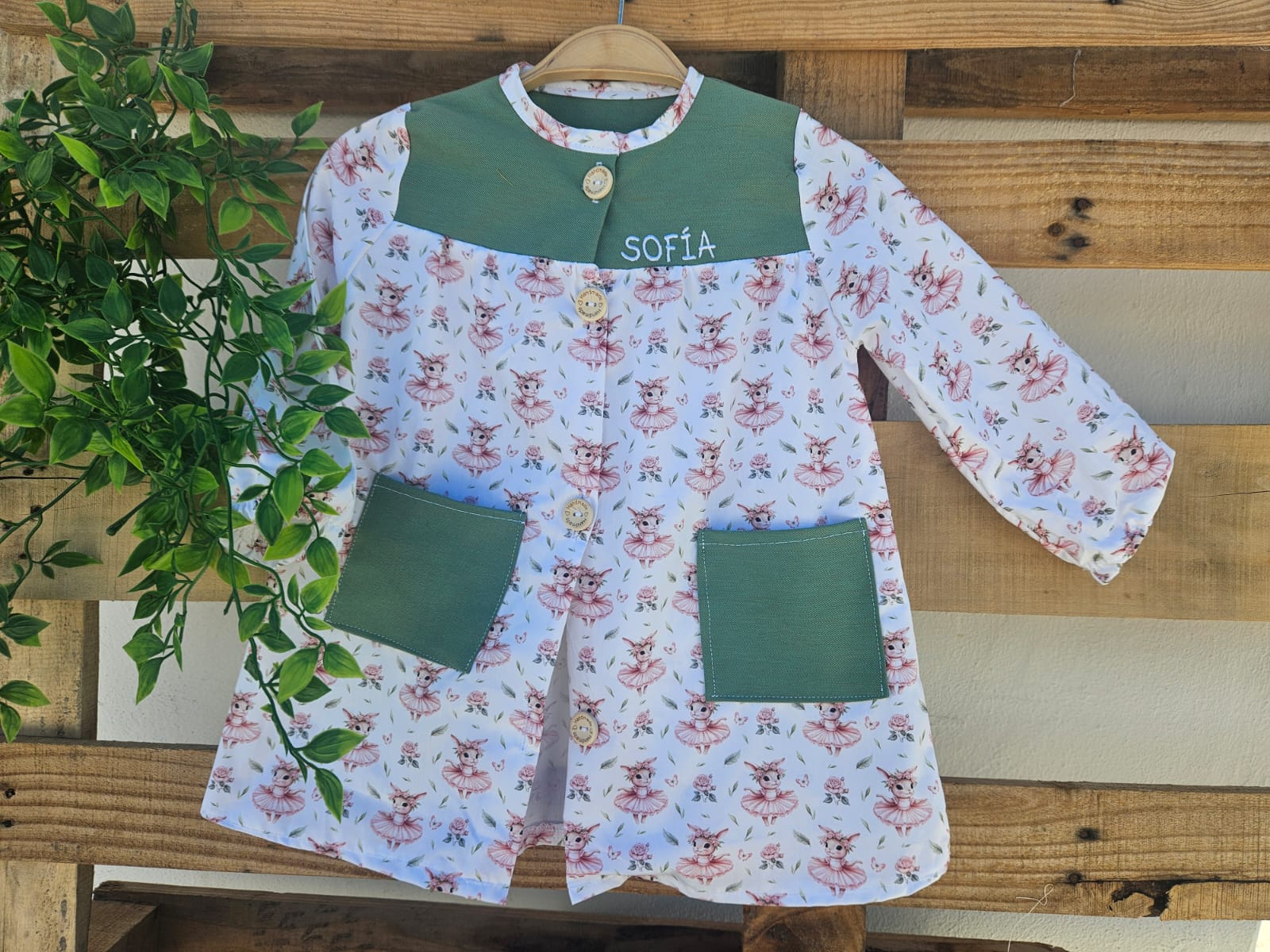 ¡La vuelta al cole será mucho más especial con este precioso babi escolar! 🌸👩🏫 Con un encantador estampado de bailarinas en tonos rosados sobre fondo blanco y detalles en verde oliva en el pecho y bolsillos, este modelo combina dulzura, estilo y practicidad. Perfecto para las pequeñas amantes de los animalitos y la danza 💖🐱