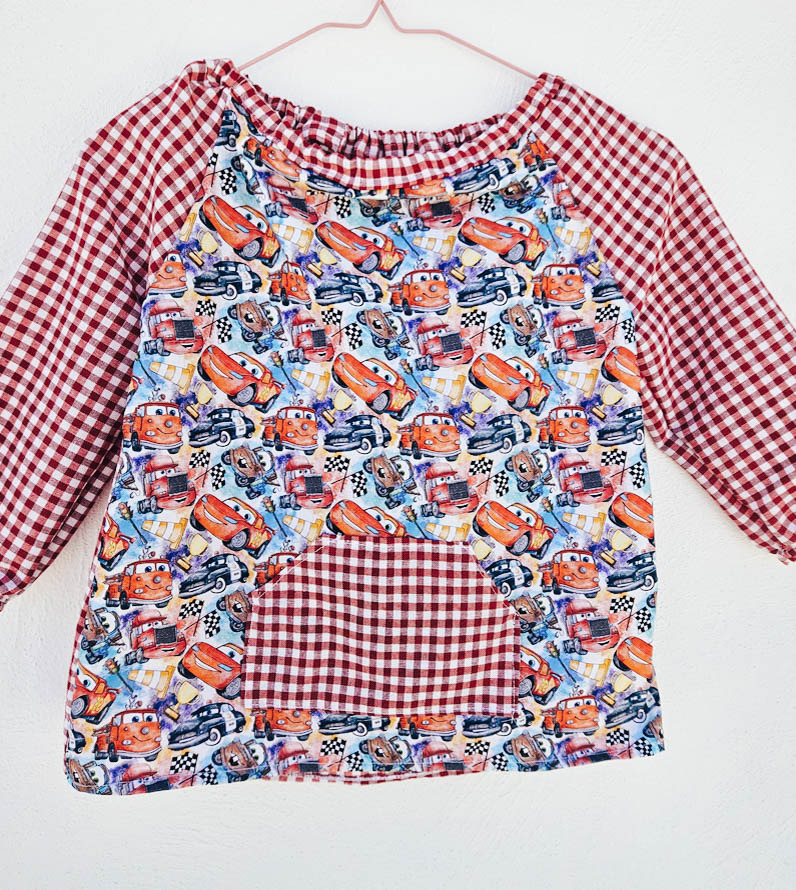Babi escolar con estampado de Cars en cuerpo y tejido de cuadros en rojo en mangas. Bolsillo central contraste en tejido de cuadros en rojo y blanco. Además, puedes AÑADIR EL NOMBRE. Consulta la tabla de medidas, PINCHANDO AQUÍ. Para cualquier duda, contacta con nosotros.