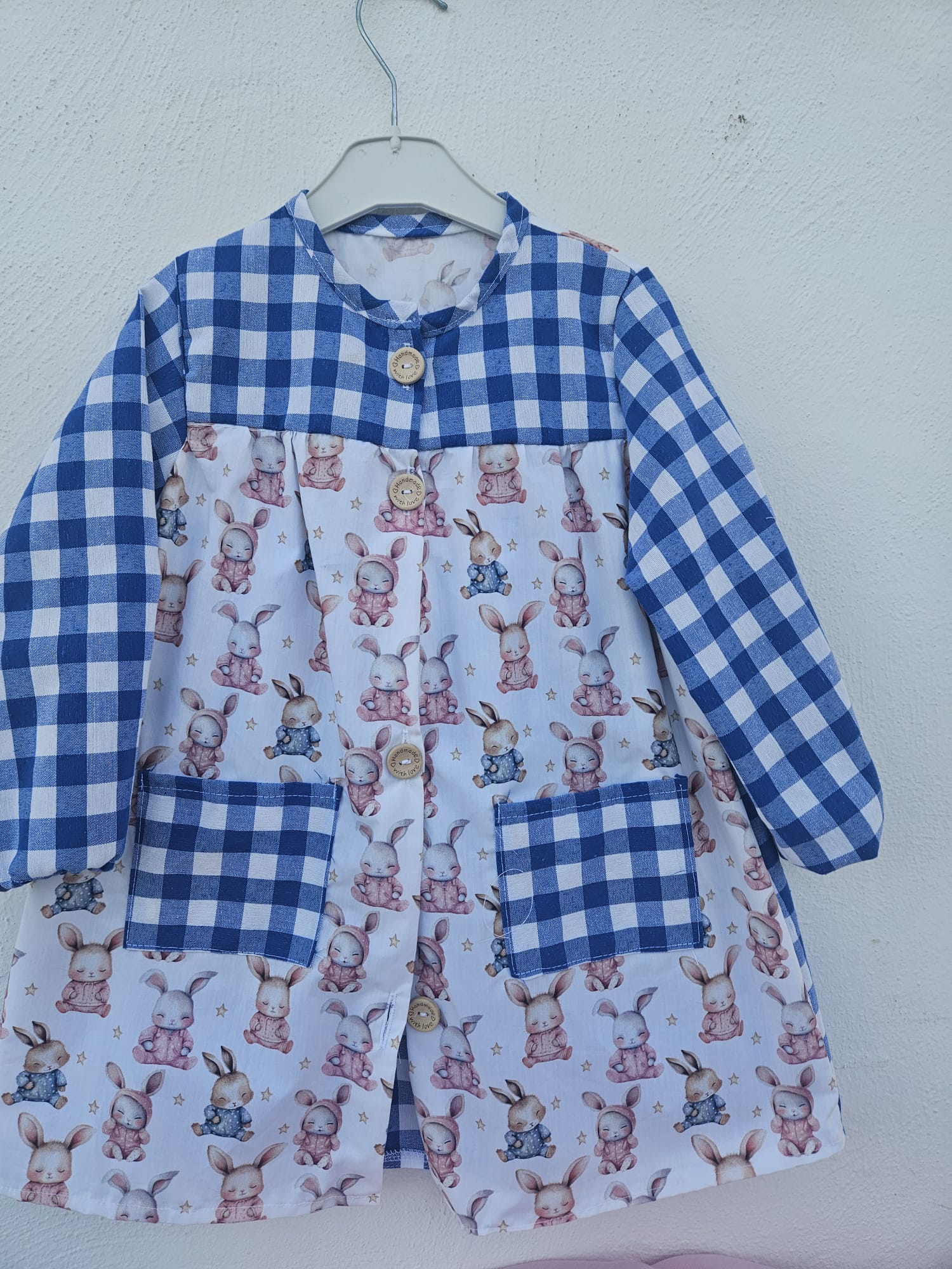 ¡La vuelta al cole será aún más tierna con este precioso babi escolar! 🐇💙 Con un diseño encantador de conejitos en el cuerpo y un tejido de cuadros en azul y blanco en el pecho, mangas y bolsillos, este modelo combina dulzura, color y practicidad. Perfecto para los más pequeños de la casa 🌟👩🏫