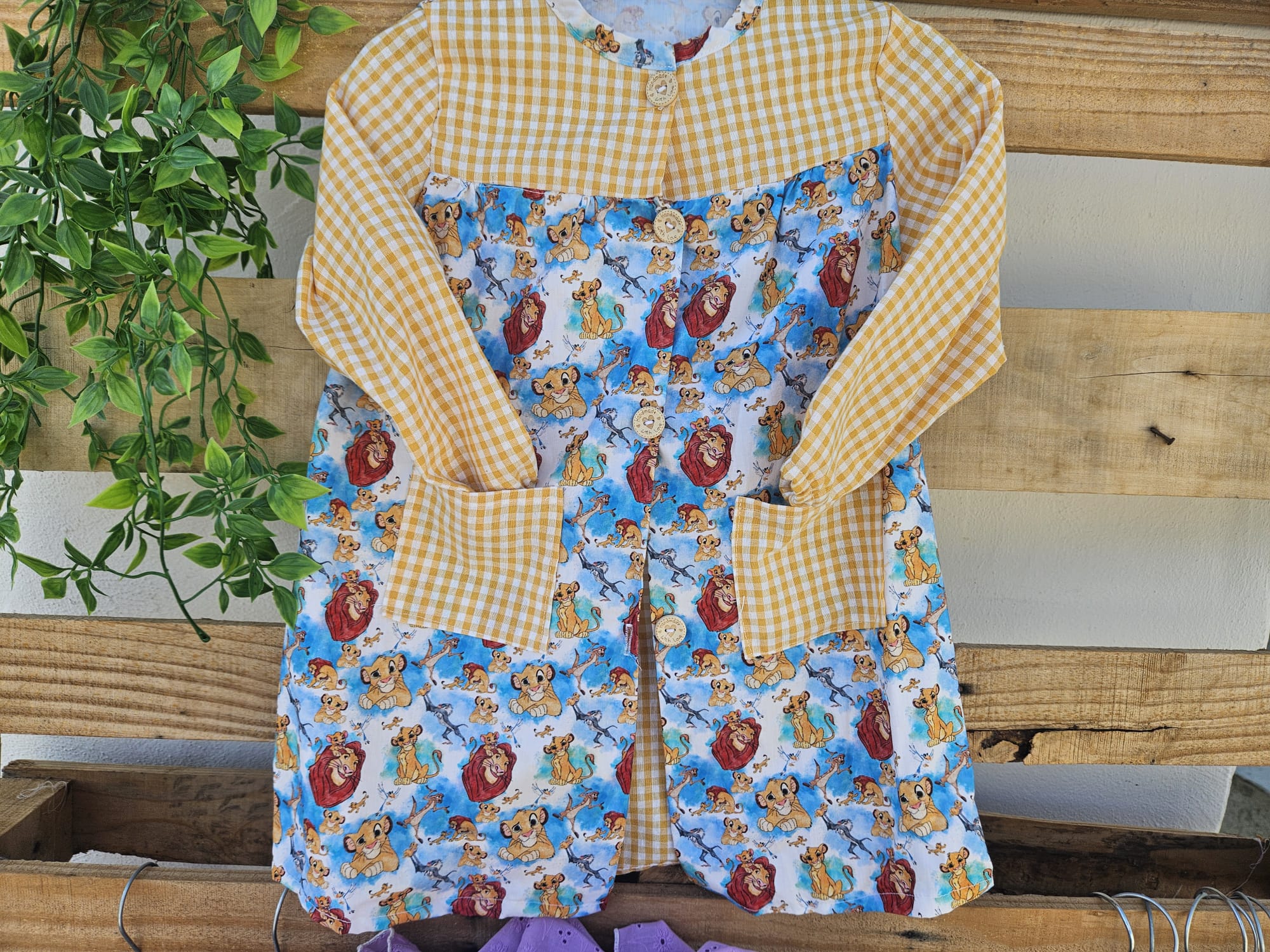 ¡Que la vuelta al cole sea toda una aventura con este precioso babi escolar! 🦁🌞 Con un alegre diseño de El Rey León en el cuerpo del babi, y un tejido de cuadros en tonos amarillo y blanco en el pecho, mangas y bolsillos, este modelo combina ternura, color y mucha diversión. Perfecto para los pequeños fans de Disney 💛