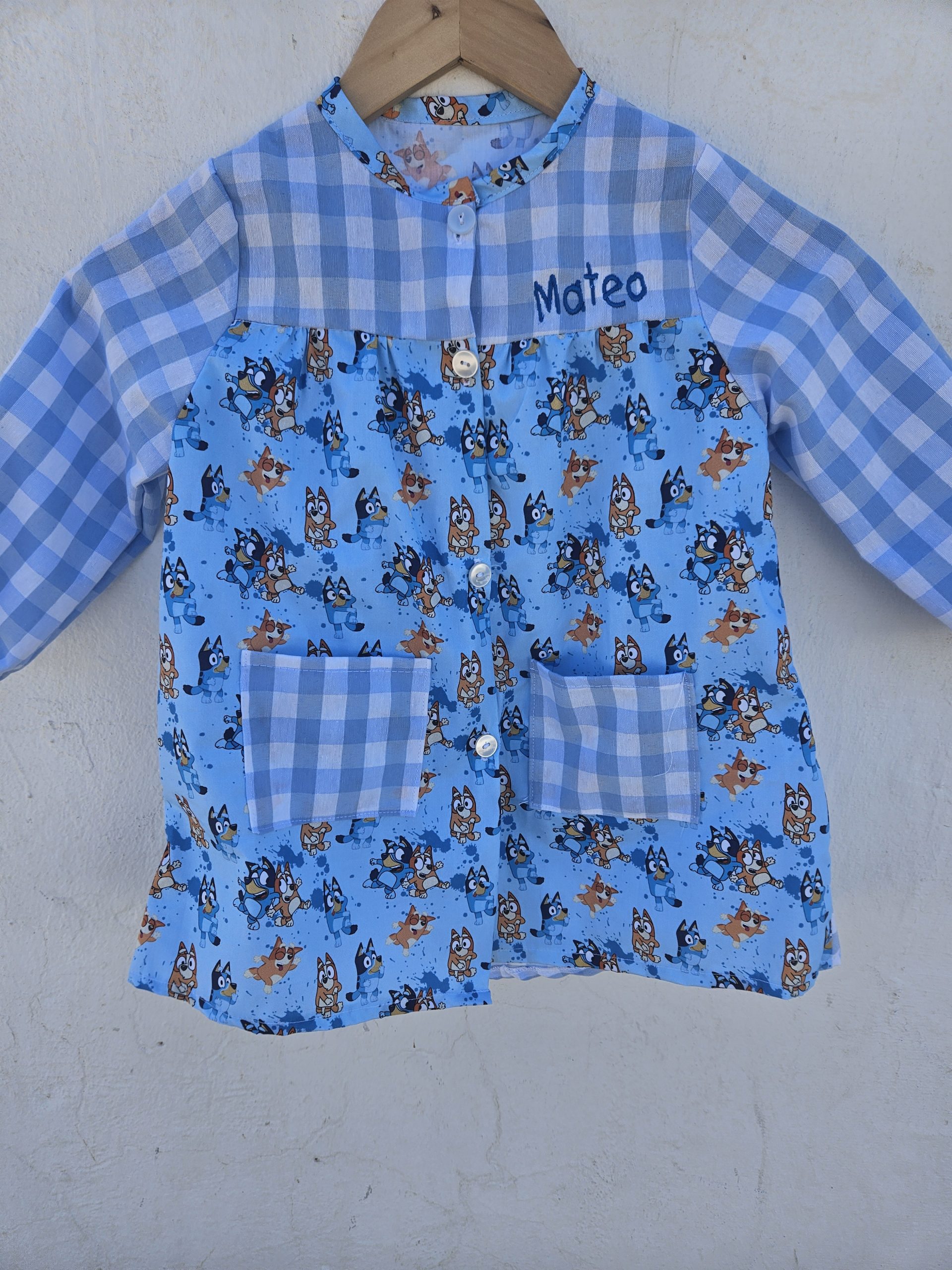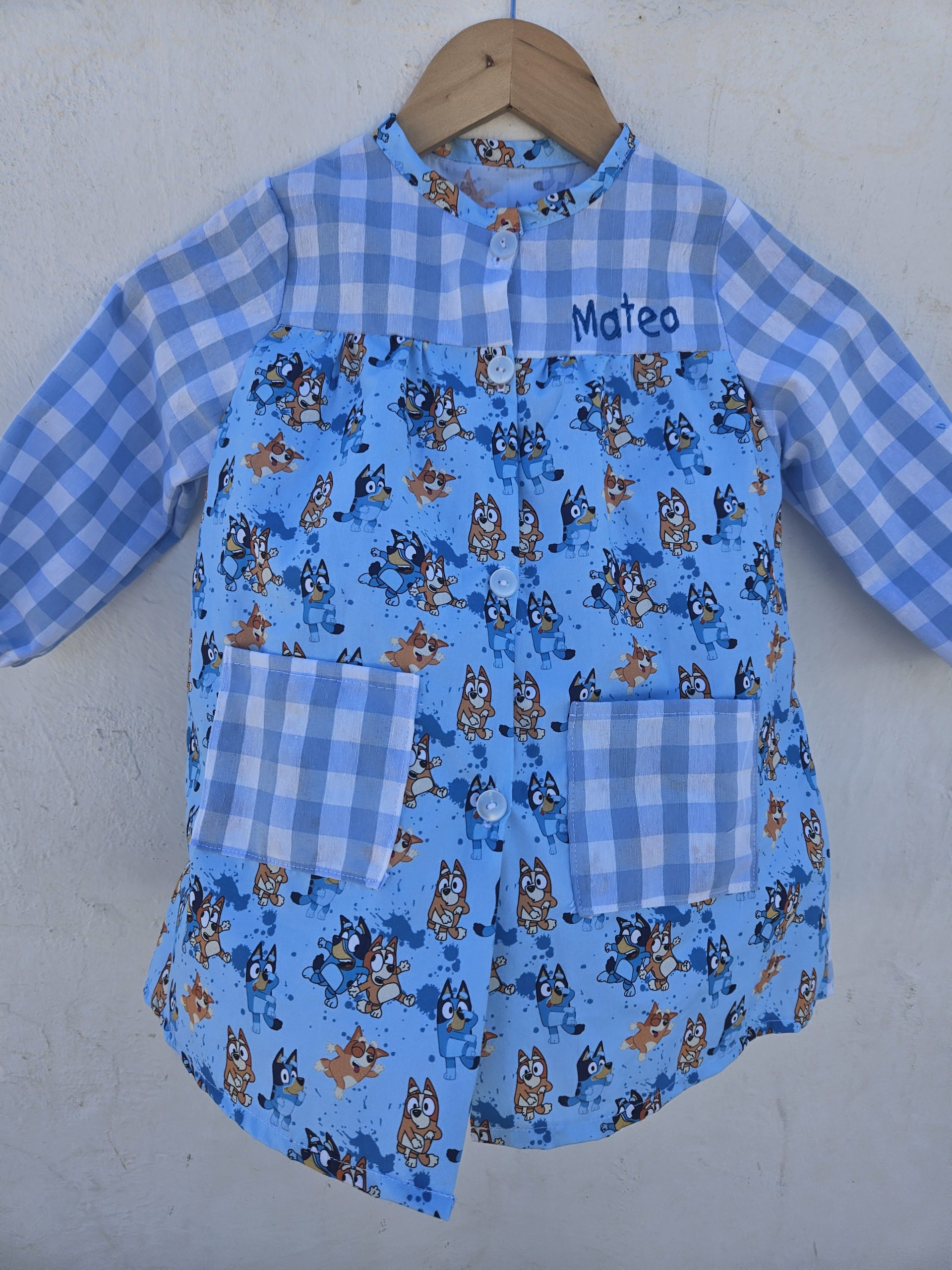 Babi escolar con estampado de animales en cuerpo y cuello, y cuadros azules en pecho y mangas. Bolsillos contraste en cuadros azules y blancos. Además, puedes AÑADIR EL NOMBRE. Consulta la tabla de medidas, PINCHANDO AQUÍ. Para cualquier duda, contacta con nosotros.