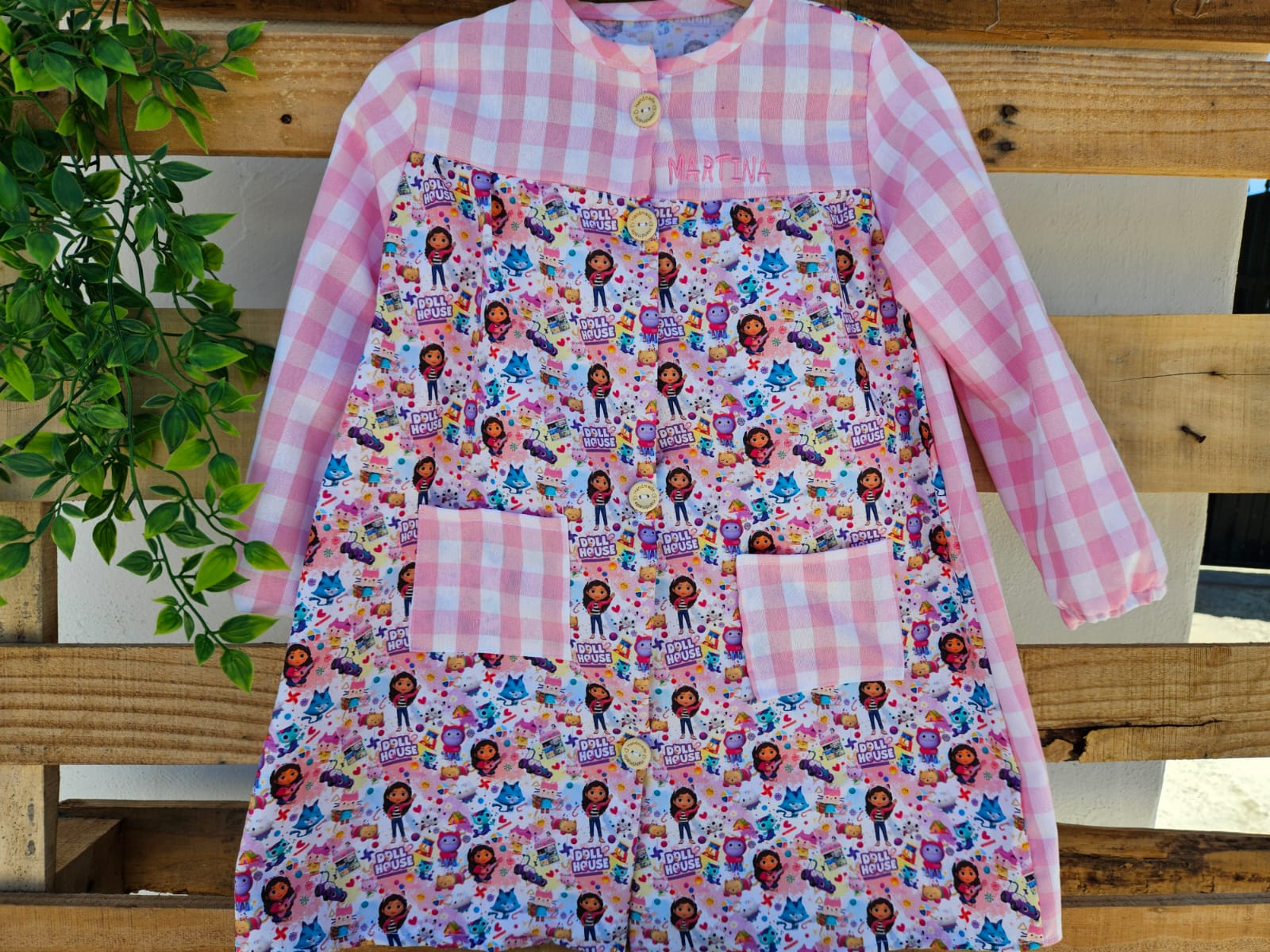 ¡Haz que la vuelta al cole sea mágica con este precioso babi escolar! 🌸👩🏫 Con un diseño encantador de Gabby’s Dollhouse en el cuerpo del babi y un tejido de cuadros en tonos rosa y blanco en el pecho, mangas y bolsillos, este modelo combina fantasía, color y comodidad. Perfecto para los pequeños fans de la serie 💖