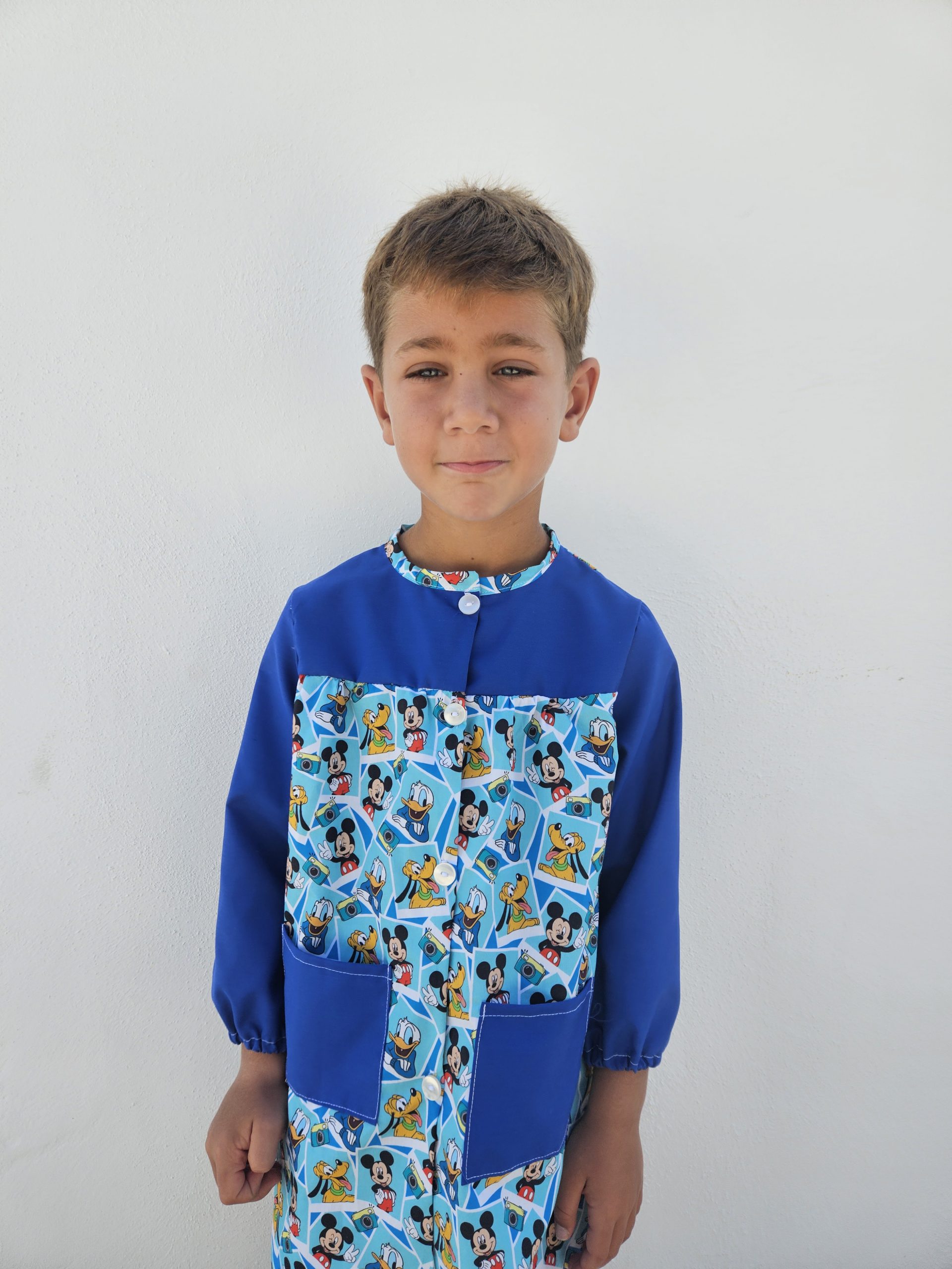 Babi escolar con estampado de Mickey, Donald y Pluto en cuerpo y cuello, y tejido liso en azul en pecho y mangas. Bolsillos contraste en tejido liso azul. Además, puedes AÑADIR EL NOMBRE. Consulta la tabla de medidas, PINCHANDO AQUÍ. Para cualquier duda, contacta con nosotros.