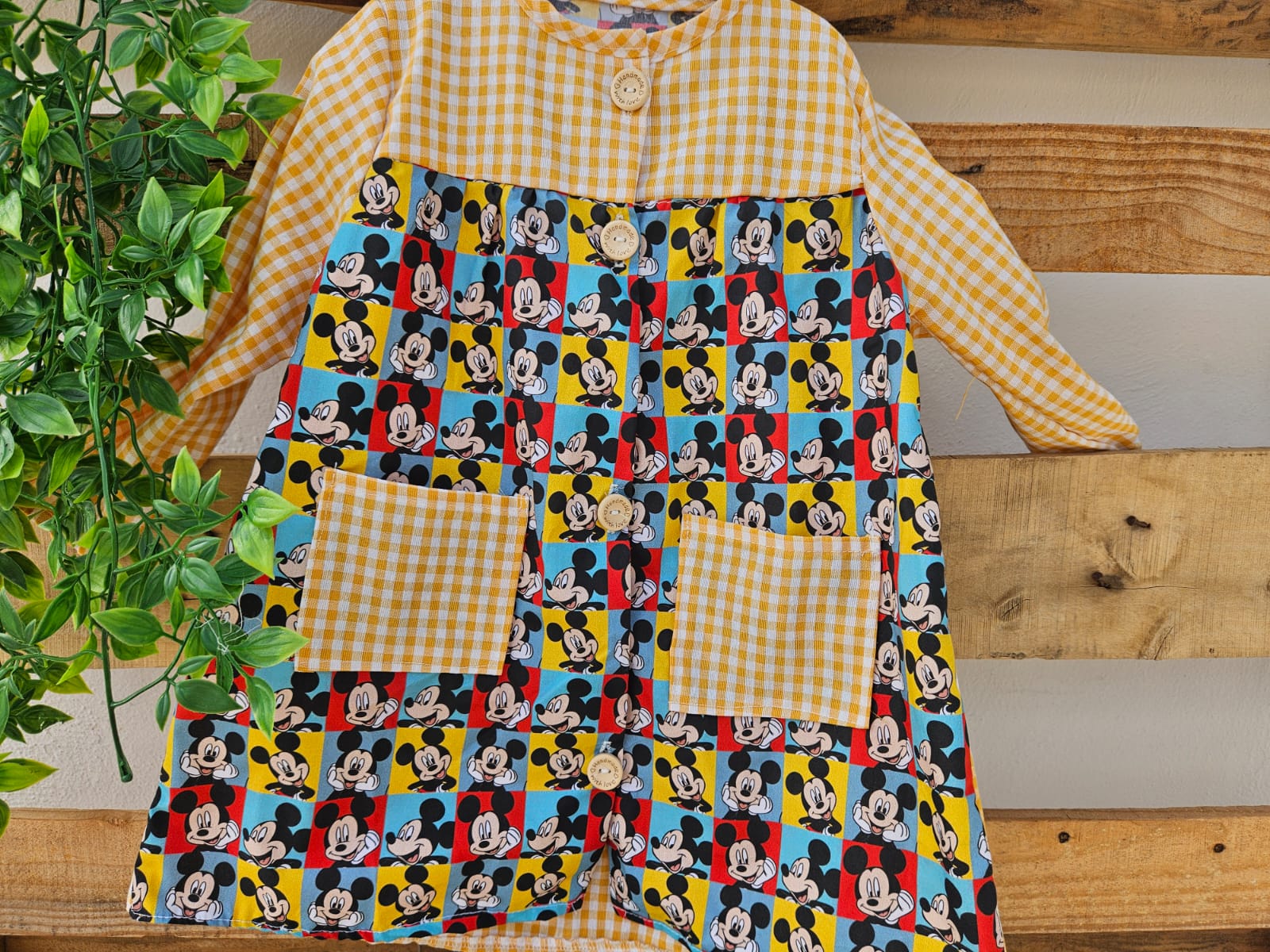 ¡La vuelta al cole será pura diversión con este encantador babi escolar! 🏫🌟 Con un alegre estampado de Mickey Mouse en el cuerpo del babi y un tejido de cuadros vichy en tonos mostaza y blanco en la parte superior, mangas y bolsillos, este diseño mezcla nostalgia, color y practicidad. ¡Ideal para los pequeños fans de Disney! 🐭❤️💛