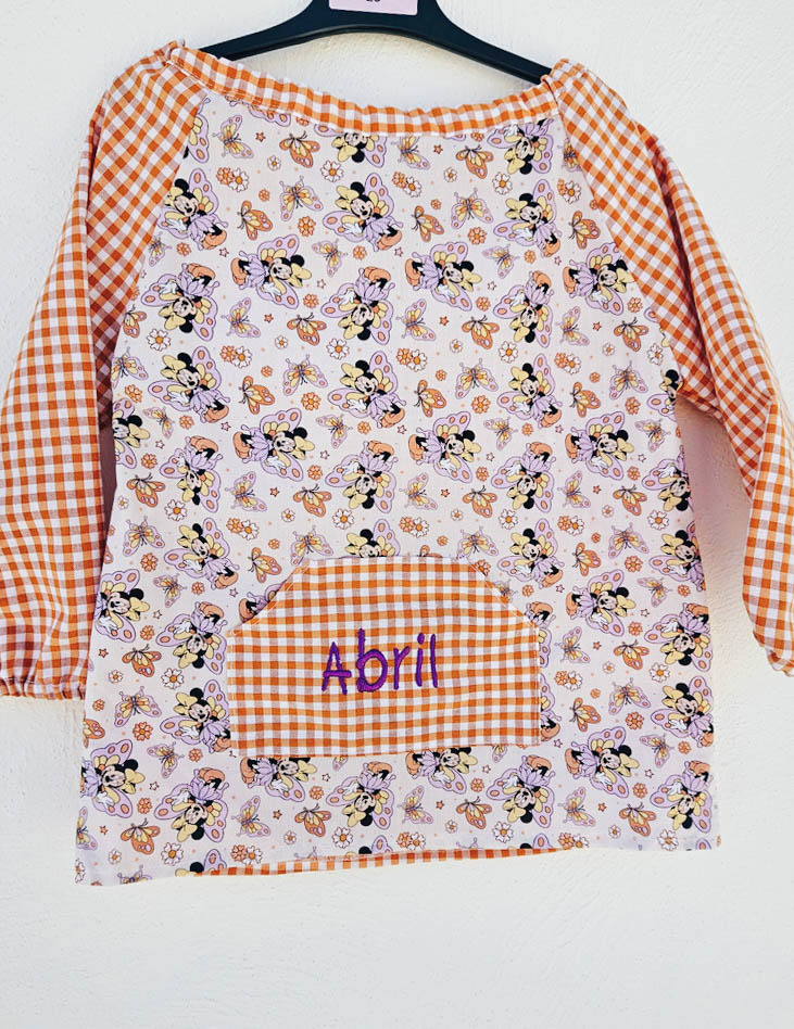 Babi escolar con estampado de Minnie Mouse en cuerpo y tejido de cuadros en naranja en mangas. Bolsillo central contraste en tejido de cuadros en naranja y blanco. Además, puedes AÑADIR EL NOMBRE. Consulta la tabla de medidas, PINCHANDO AQUÍ. Para cualquier duda, contacta con nosotros.