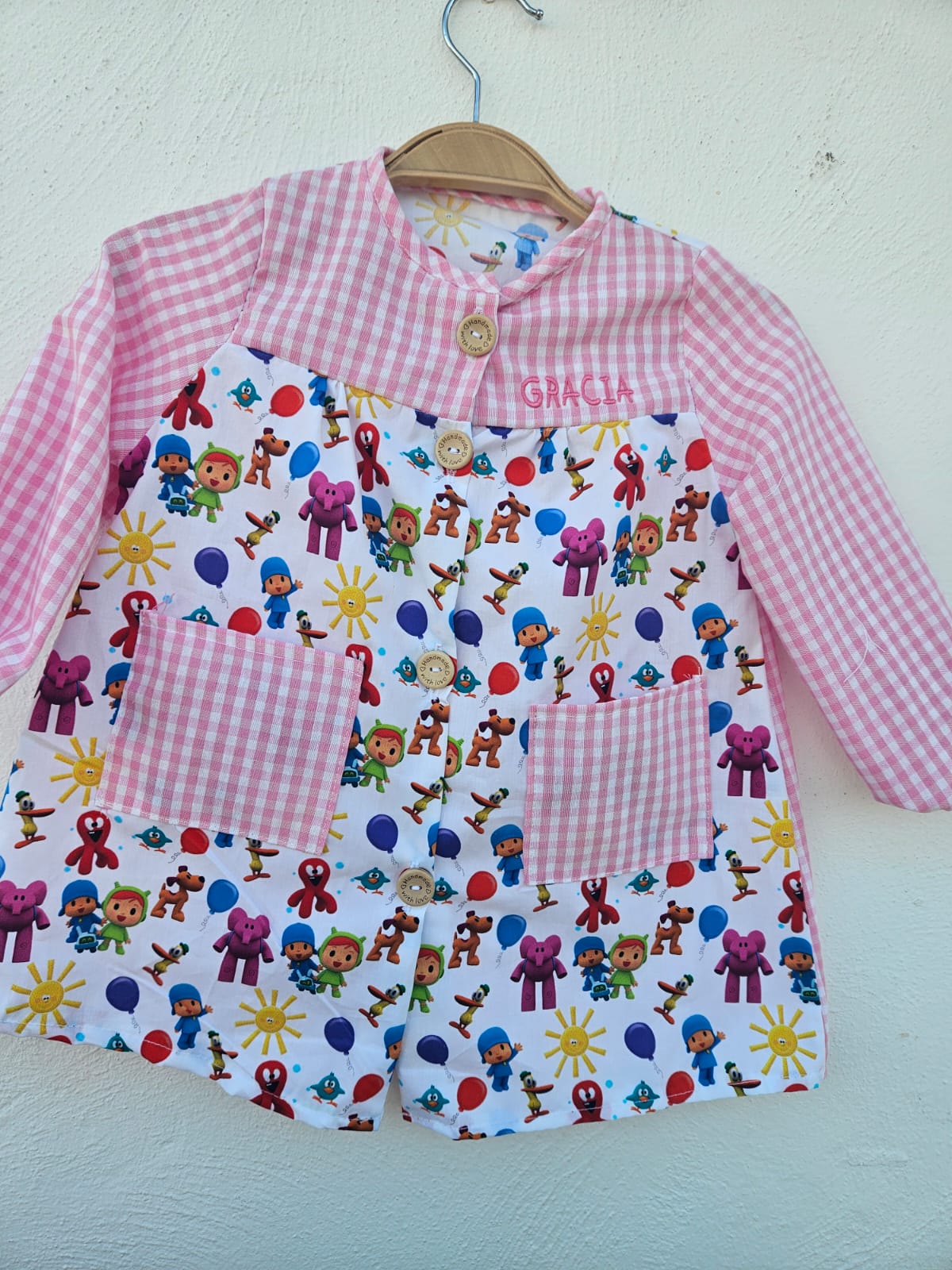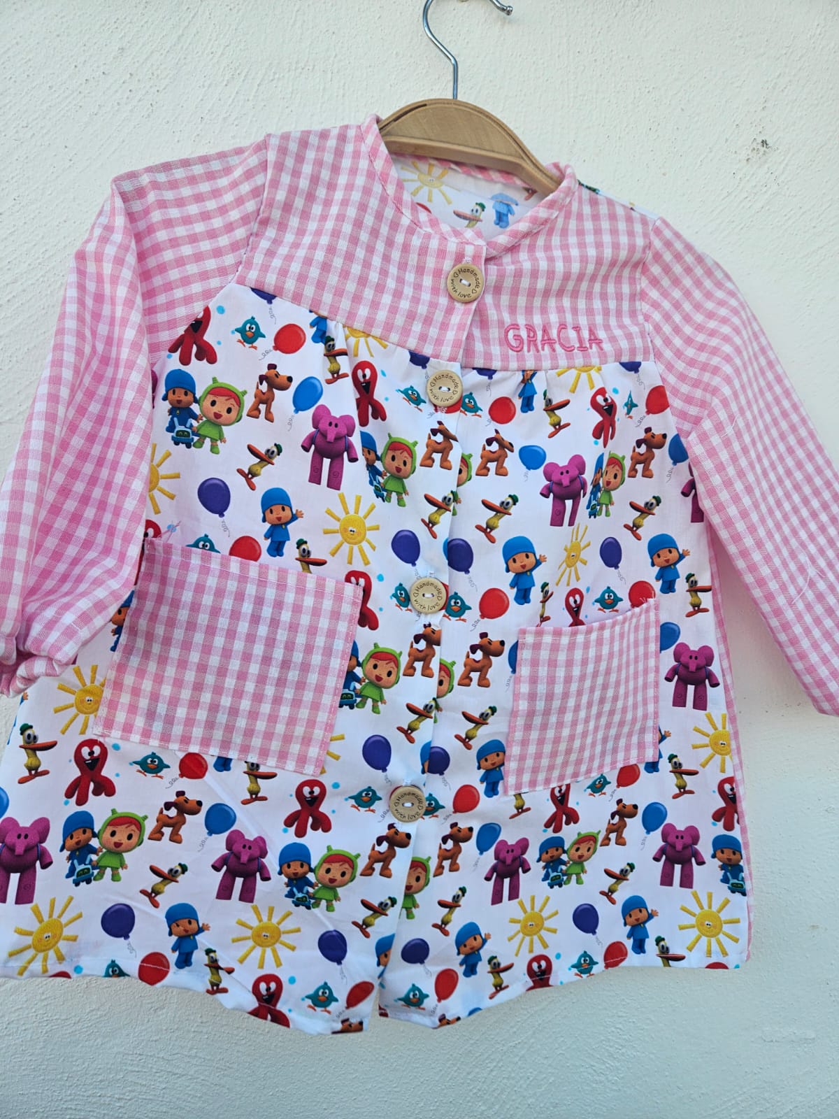 ¡Haz que la vuelta al cole sea más divertida con este adorable babi escolar! 🌸👩🏫 Con un encantador diseño de Pocoyó y sus amigos en el cuerpo del babi, y un tejido de cuadros en tonos rosa y blanco en el pecho, mangas y bolsillos, este modelo combina fantasía, color y funcionalidad. Perfecto para los pequeños fans de la serie 💖