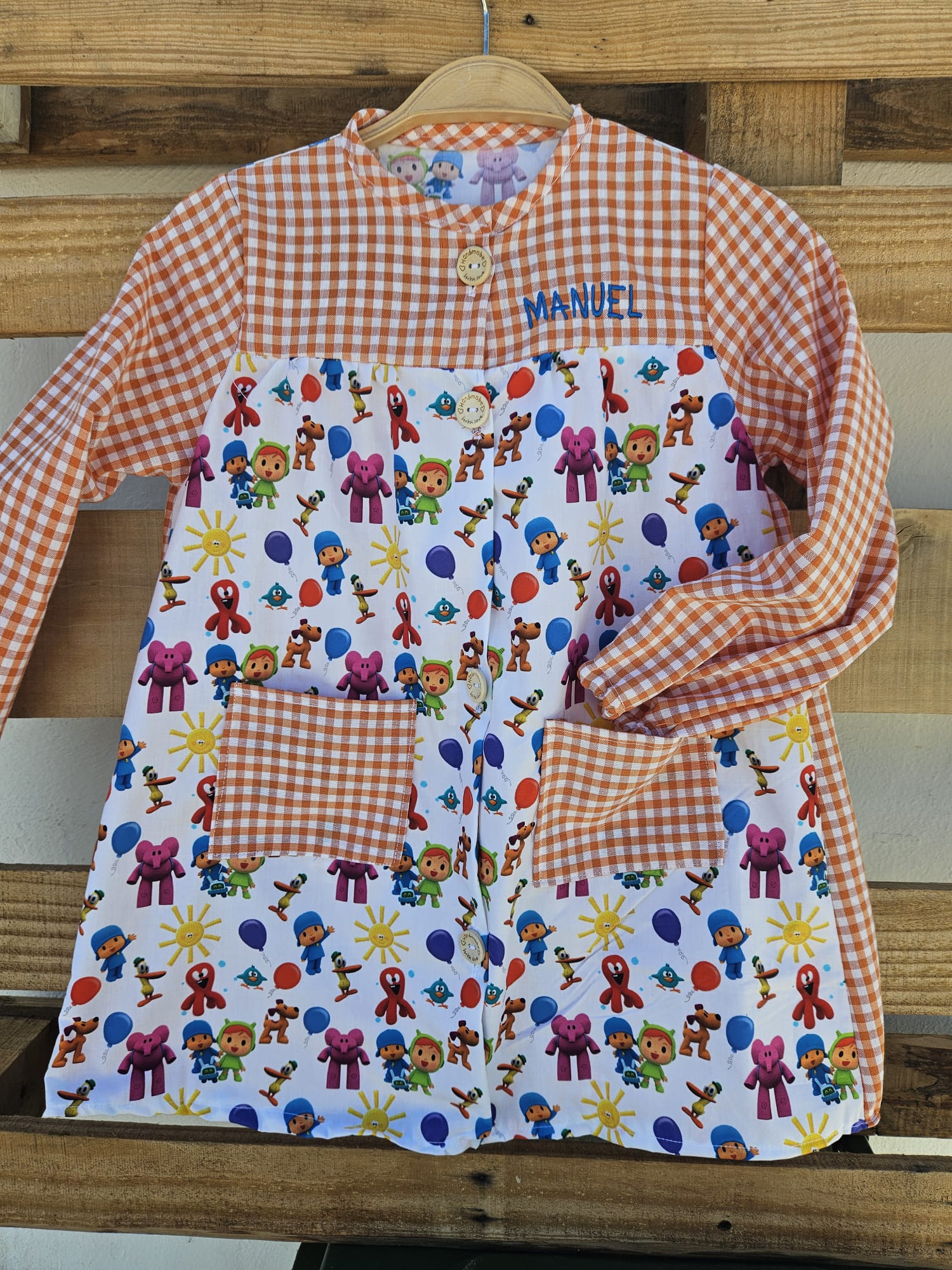 ¡La hora de ir al cole será mucho más alegre con este precioso babi escolar! 🎒🌈 Con un divertido diseño de Pocoyó y sus amigos en el cuerpo del babi, y un tejido de cuadros en tonos naranja y blanco en el pecho, mangas y bolsillos, este modelo combina ternura, color y comodidad. Ideal para los pequeños fans de la serie 💙🐘