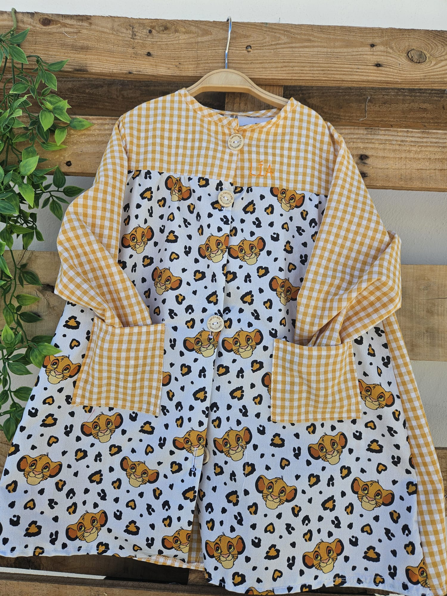 ¡Haz que la vuelta al cole sea más alegre con este precioso babi escolar! 🌟👩🏫 Con un divertido diseño de Simba en el cuerpo del babi y un tejido de cuadros en tonos mostaza y blanco en el pecho, mangas y bolsillos, este modelo combina ternura, color y practicidad. Perfecto para los pequeños fans de El Rey León 💛🦁