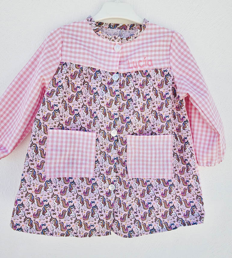 Babi escolar con estampado de Unicornio en cuerpo y cuello, y tejido de cuadros en rosa en pecho y mangas. Bolsillos contraste en tejido de cuadros en rosa y blanco. Además, puedes AÑADIR EL NOMBRE. Consulta la tabla de medidas, PINCHANDO AQUÍ. Para cualquier duda, contacta con nosotros.