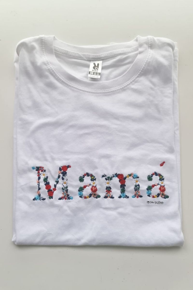 Camiseta blanca con el nombre «Mamá» bordado de colores con florecillas.