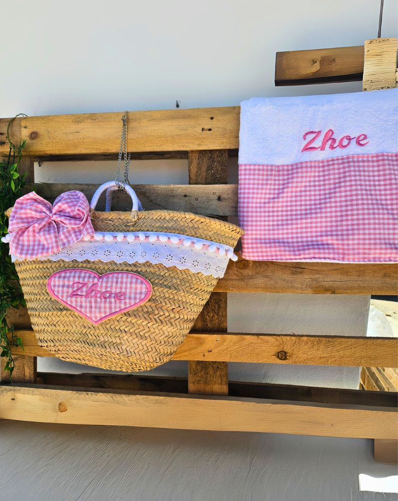 🧺 Cesta de palma con cuadros vichy rosa + toalla: el must del verano 🩷
