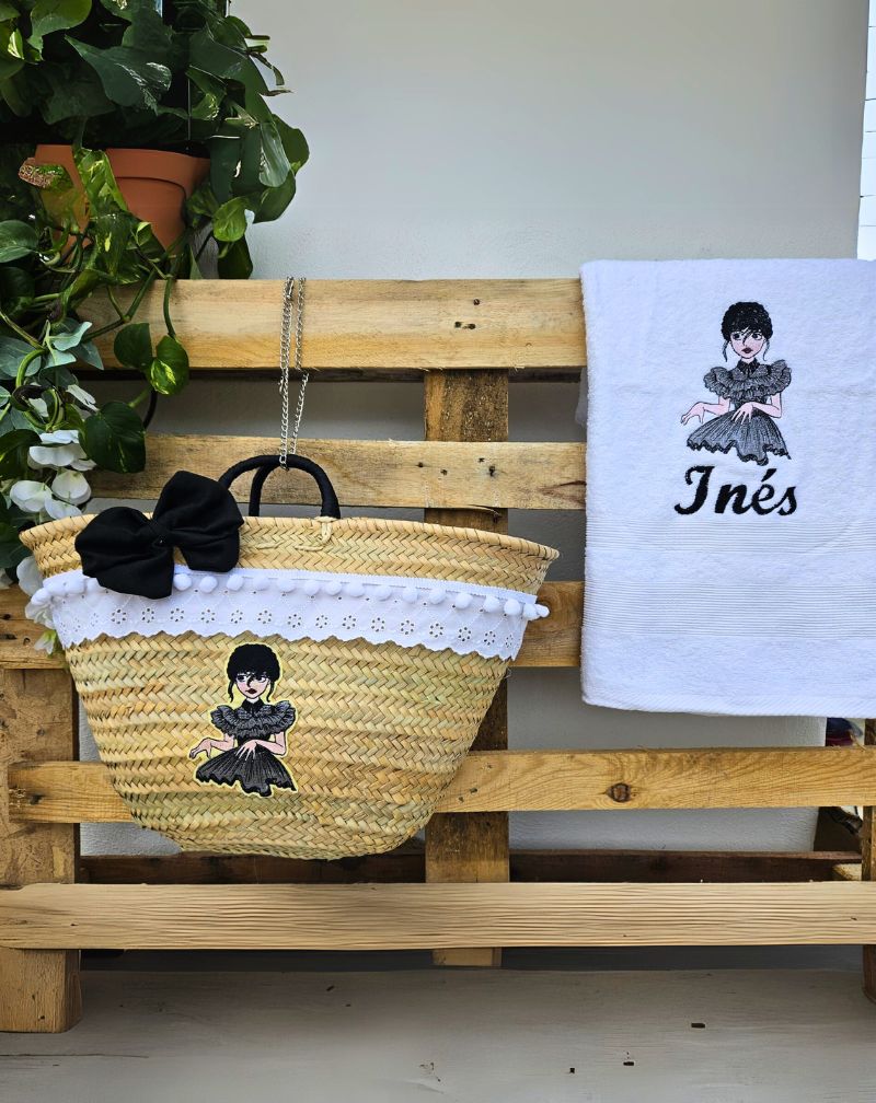 La cesta de palma para la playa de Miércoles Addams de Telas y Retales es perfecta para quienes adoran el estilo gótico y original. Hecha a mano con palma natural, esta cesta incluye una toalla a juego y detalles inspirados en el personaje de la familia Addams. Ideal para la playa o la piscina, es espaciosa, resistente y cómoda de llevar. Encuentra este y otros diseños únicos en 👉 www.telasyretales.com. ¡Este verano, presume de estilo con un toque oscuro y divertido! 🖤