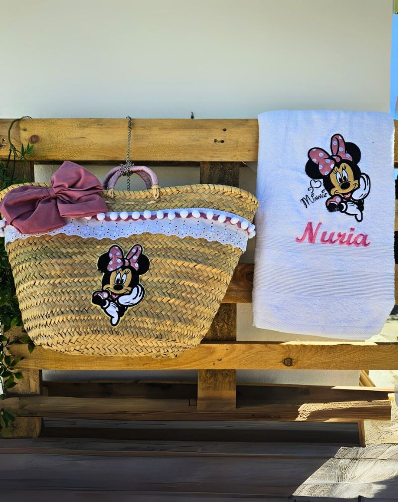 🧺 Cesta de palma para la playa de Minnie Mouse con toalla – Telas y Retales 🎀