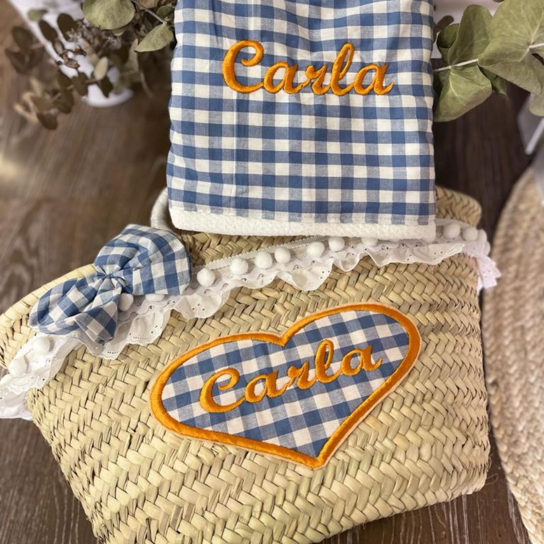 Cesta ideal para la playa y para la piscina de cuadros vichy azul. Incluye toalla a juego.