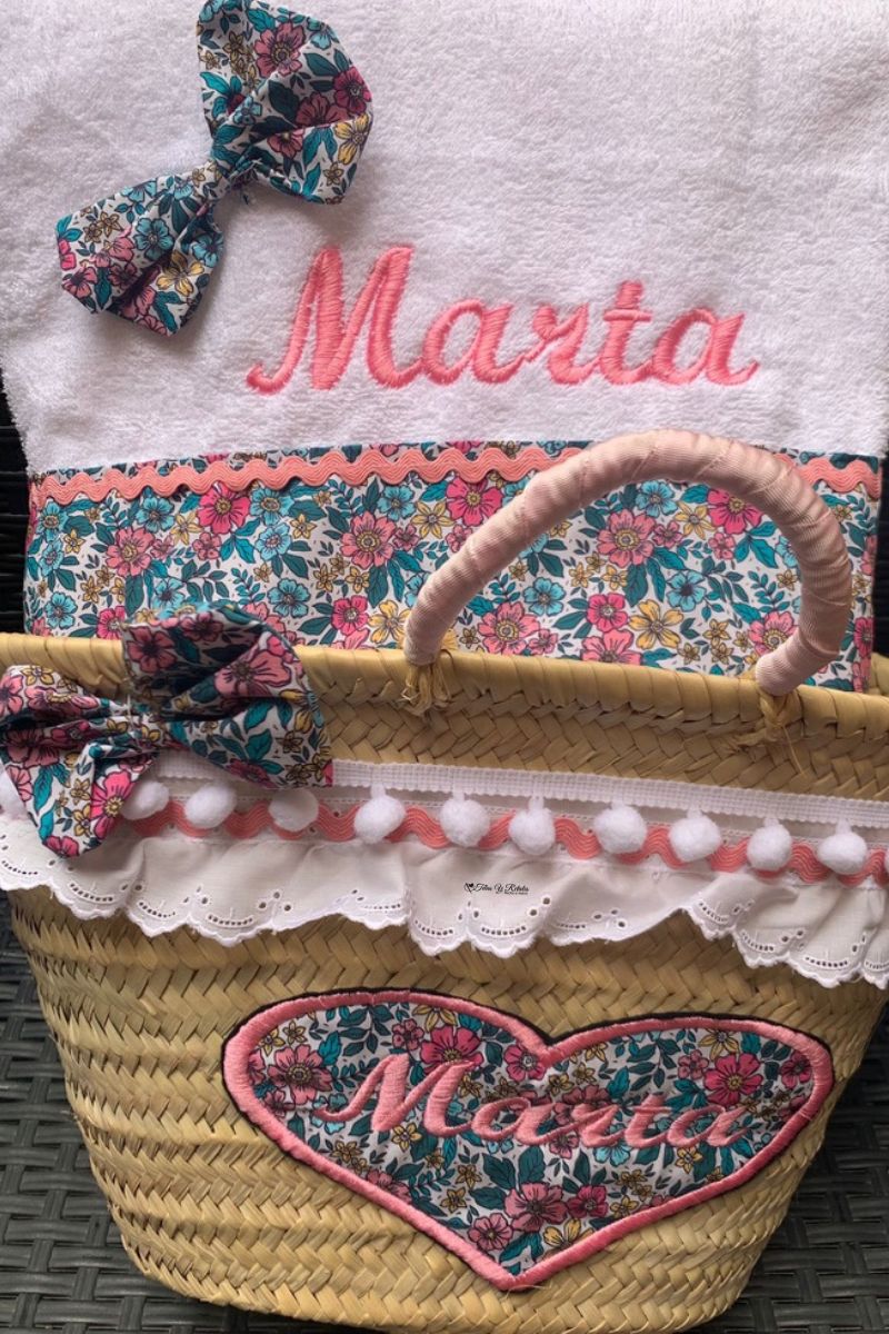 Cesta de playa personalizada de estampado floral. Incluye toalla a juego.