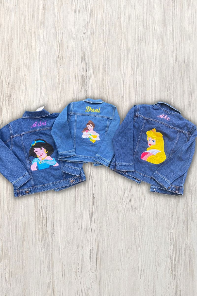 Cazadora vaquera de las princesas. Elige tu princesa favorita y personaliza esta cazadora vaquera de las princesas con tu nombre.