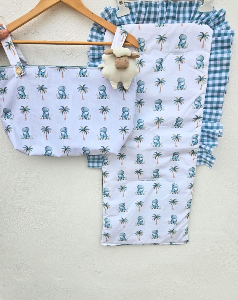 La colchoneta de silla de paseo con bolso panera diseño dinosaurio de Telas y Retales es la opción ideal para mantener a tu bebé cómodo y a la moda mientras paseáis juntos. Con un diseño tierno de dinosaurios y materiales de alta calidad, este conjunto proporcionará la máxima comodidad durante los paseos diarios.