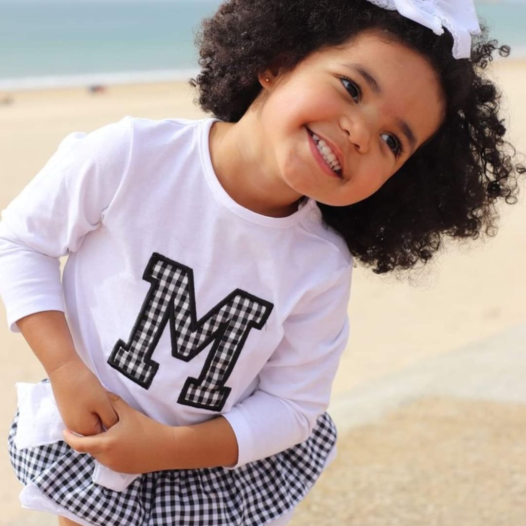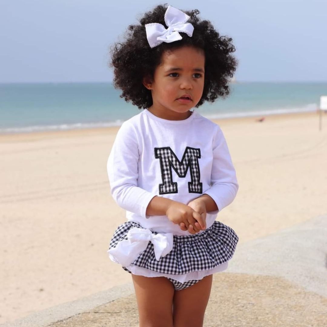 ¿Te encantan las telas de cuadros vichy? Este conjunto está formado por camiseta con inicial en cuadro vichy y cubrepañal con volantes de tel de cuadro vichy en negro. Súper bonito. Puedes elegir la talla y el tipo de camiseta. Ya sea con mangas largas o mangas cortas.