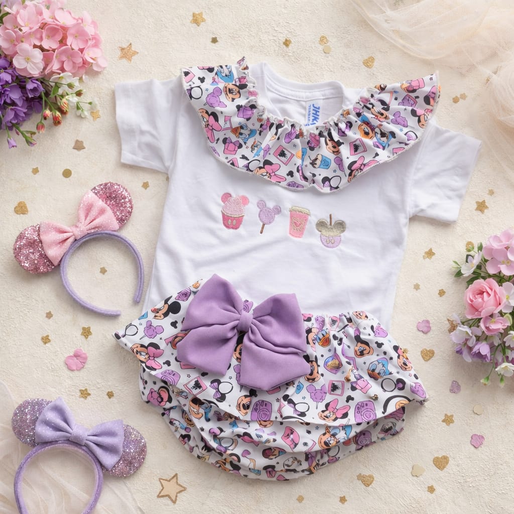 El cubrepañal con volantes, a juego con el estampado de Minnie, incorpora un gran lazo decorativo, convirtiéndolo en una prenda tan cómoda como irresistible. Su diseño permite total libertad de movimiento, ideal para el día a día o para ocasiones especiales. Este conjunto es perfecto para cumpleaños, sesiones de fotos, eventos familiares o como regalo especial, logrando un look único y lleno de magia ✨