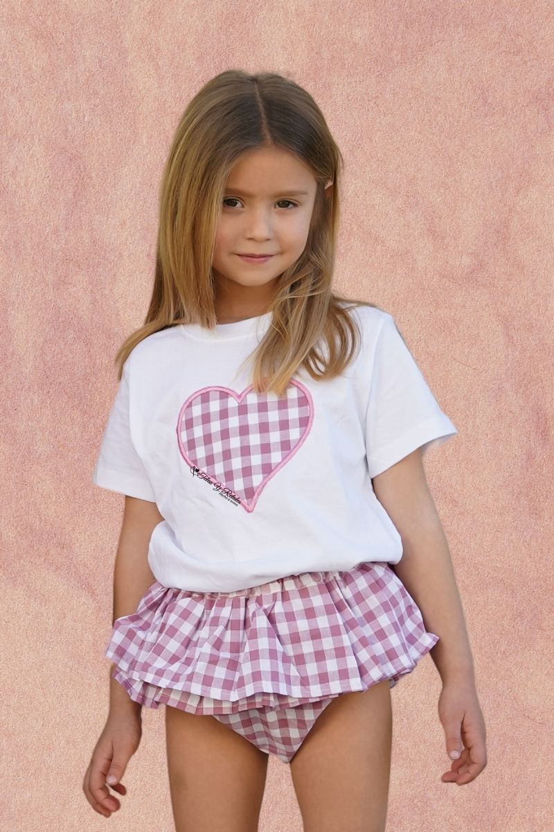 Si te gusta los cuadros de vichy estas en la web perfecta. Conjuntos personalizados con corazón en la camiseta de tela de cuadros de vichy rosa que podrás encontrar en Telas y Retales. Elige la talla perfecta d tu peque y al carrito.