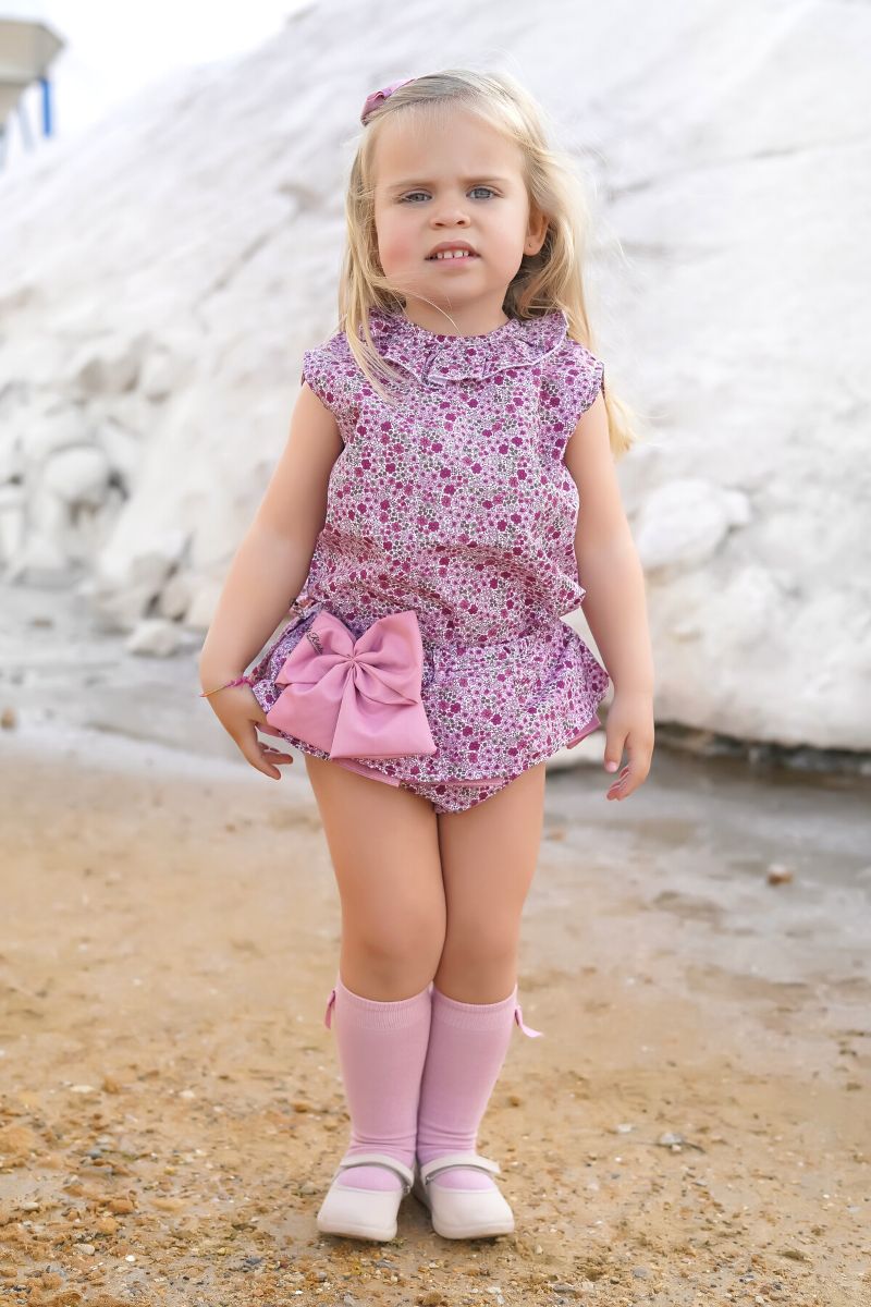 Estrenamos diseño de conjunto esta nueva temporada primavera – verano. Conjunto de camisa y cubre con volante de estampado floral rosa. ¡Una moneria!