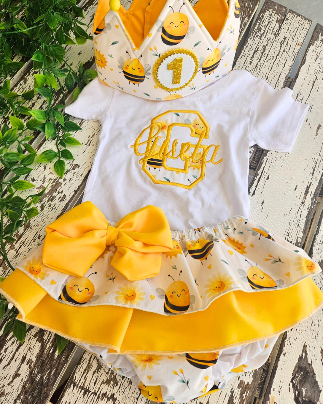 👕 Camiseta personalizada: Con una gran inicial decorada en tonos amarillos y detalles de abejitas, acompañada del nombre bordado. Confeccionada en tejido suave y agradable, perfecta para garantizar comodidad durante toda la celebración 🌼🎀 Falda o cubrepañal a juego: Elaborada con el mismo estampado de abejitas y flores, con un precioso lazo grande en color amarillo que aporta un toque alegre, dulce y perfectamente coordinado 🐝✨