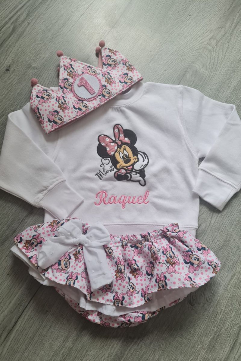 Conjunto de cumpleaños de la minnie son los más vendidos en nuestra web. Os presentamos este nuevo conjunto de cumpleaños de la minnie compuesto con corona de cumpleaños, sudadera blanca de la minnie y cubrepañal con volantes de la tela de minnie exclusiva de Telas y Retales. Personalízalo con el nombre y los añitos que cumple.