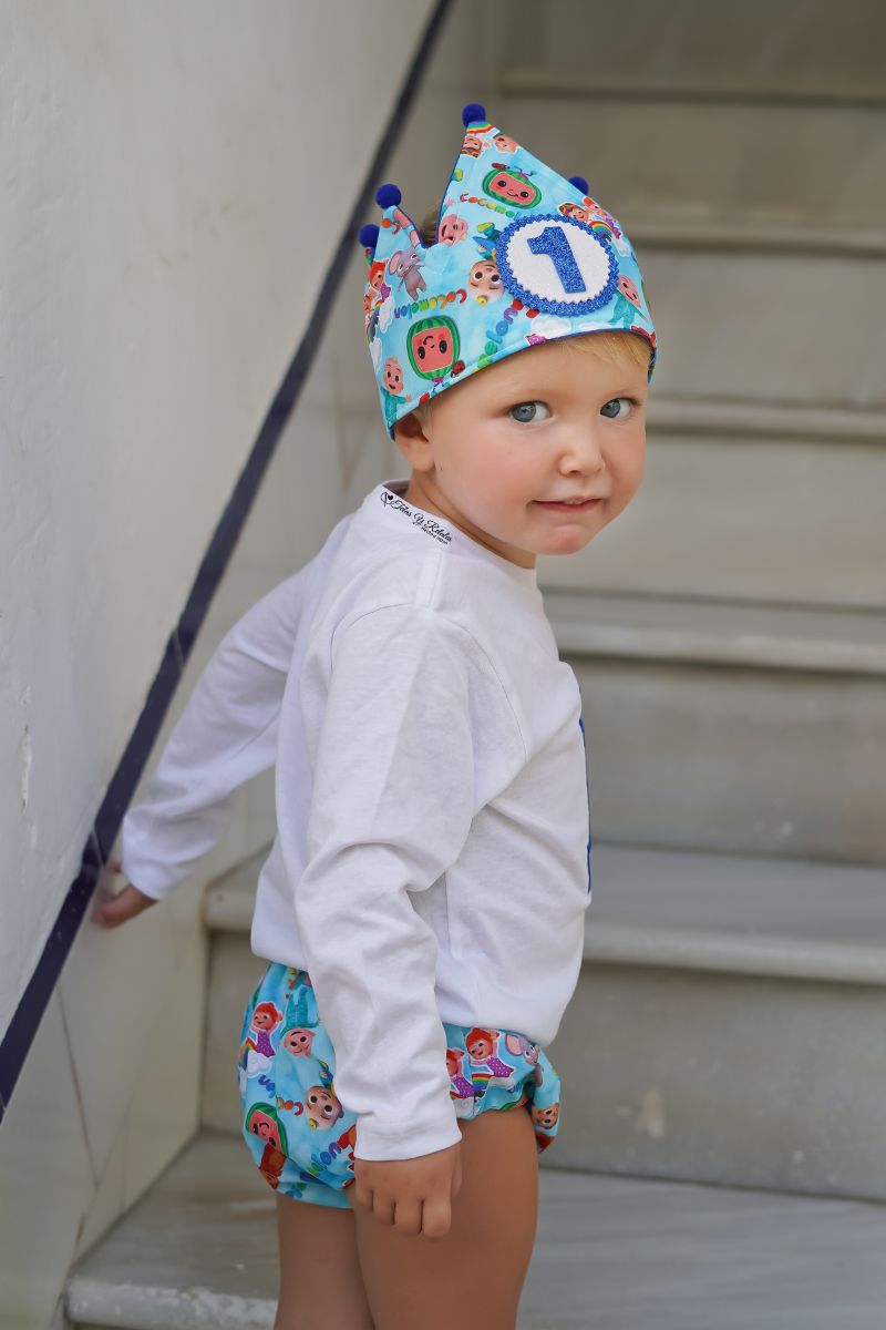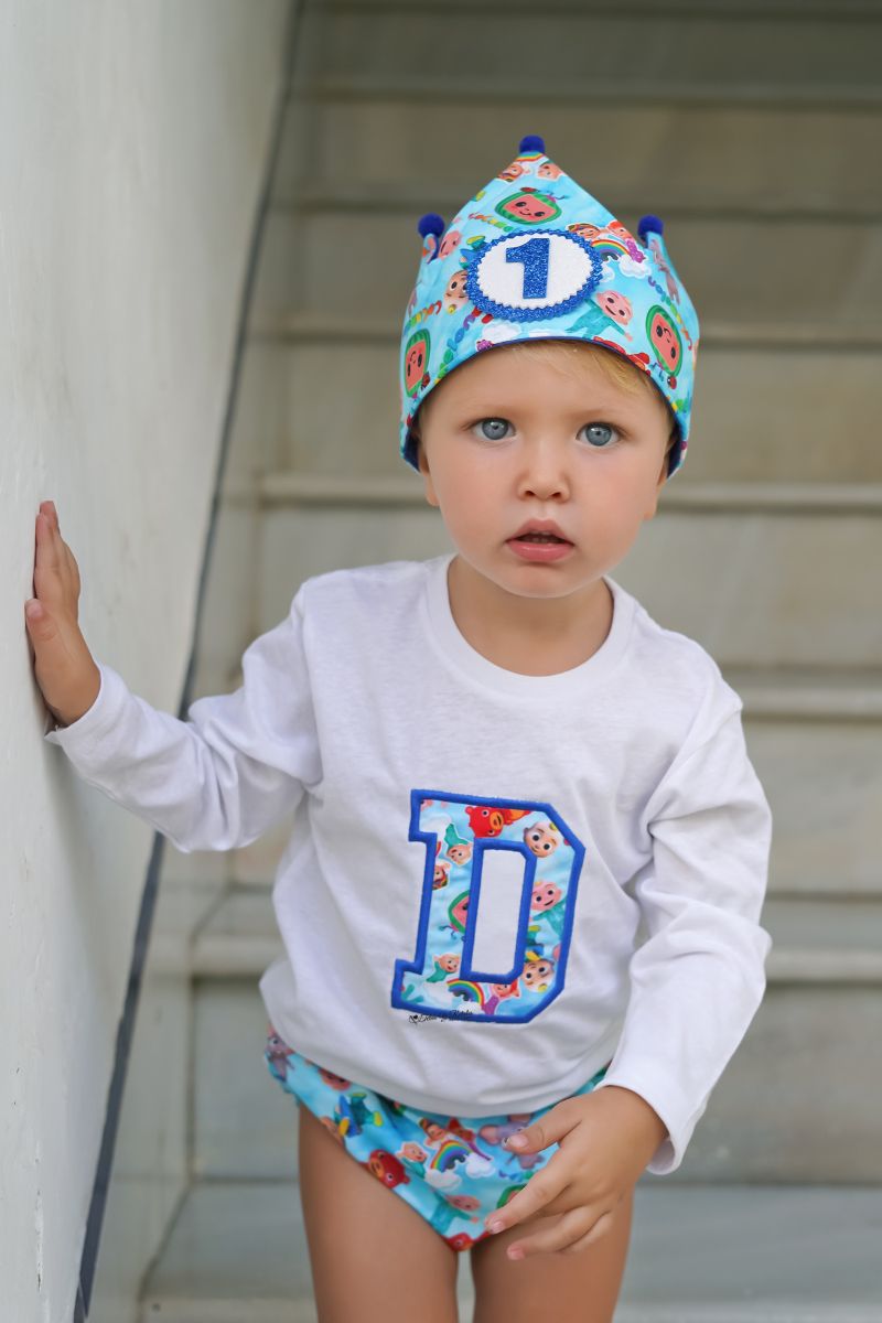 Modelo | Conjunto-Cumpleaños-camiseta-inicial-cubrepañal-cocomelon |