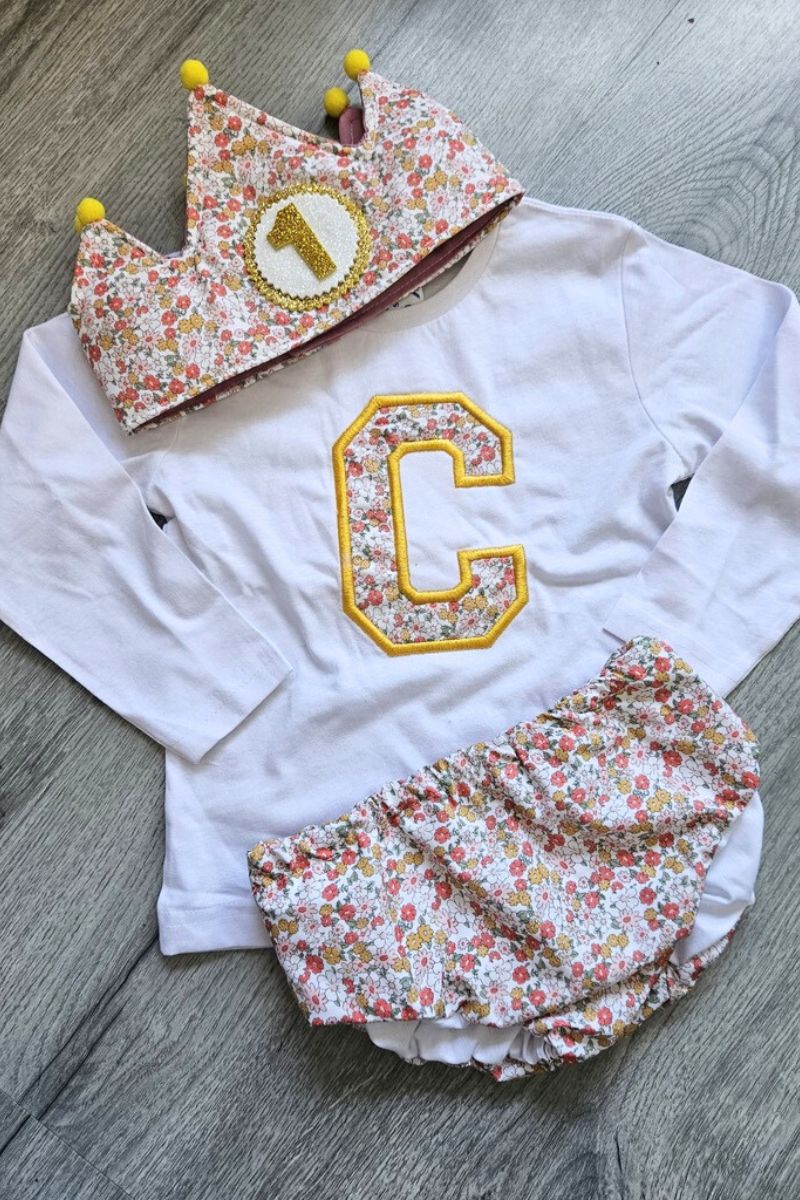 Conjunto de cumpleaños de camiseta blanca con inicial a conjunto con el cubrepañal de estampado de flores naranjas. ¡Súper bonito!. Os presentamos este nuevo conjunto de cumpleaños compuesto con corona de cumpleaños, camiseta personalizada con inicial y cubrepañal de tela exclusiva de Telas y Retales. Personalízalo co la inicial y los añitos que cumple tu peque.