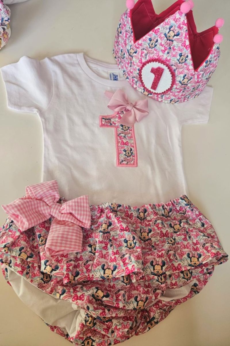 Conjunto de cumpleaños de camiseta blanca con número a conjunto con el cubrepañal con volantes de minnie bailarina. ¡Súper bonito!. Os presentamos este nuevo conjunto de cumpleaños compuesto con corona de cumpleaños, camiseta y cubrepañal de tela exclusiva de Telas y Retales. Personalízalo con los añitos que cumple tu peque.