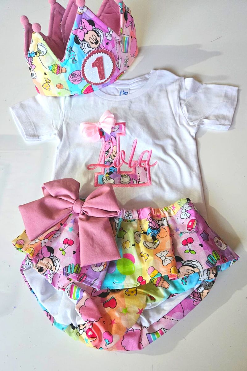Conjunto de cumpleaños de camiseta blanca con inicial y nombre a conjunto con el cubre pañal con volantes de minnie colorines. ¡Súper bonito!. Os presentamos este nuevo conjunto de cumpleaños compuesto con corona de cumpleaños, camiseta y cubrepañal con volantes de tela exclusiva de Telas y Retales. Personalízalo con el nombre, la inicial y los añitos que cumple tu peque.
