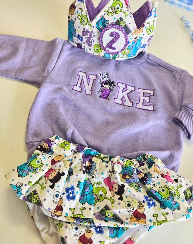 Si estás buscando un conjunto único y personalizado para celebrar el cumpleaños de tu pequeño fan de Monstruos SA, en Telas y Retales tenemos la opción perfecta. Nuestro Conjunto de Cumpleaños de Monstruos SA está diseñado para que los más pequeños luzcan un look increíble en su día especial. Este set exclusivo incluye una corona de cumpleaños decorada con los divertidos personajes de la película, una sudadera cómoda y acogedora, y un cubrepañal con volante, todo confeccionado con nuestra tela exclusiva de Monstruos SA.