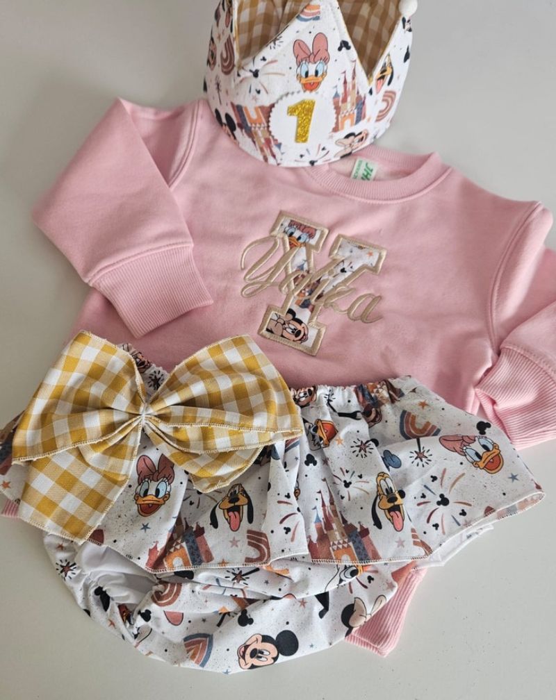 El conjunto incluye una sudadera personalizada, donde podrás bordar el nombre y la inicial del pequeño. Con un diseño inspirado en los clásicos personajes de Disney, esta prenda no solo es adorable, sino también cómoda, confeccionada con materiales de alta calidad que son suaves al tacto y adecuados para la delicada piel de los niños. Disponible en varios colores y tallas, se adapta perfectamente a cualquier estilo de fiesta.