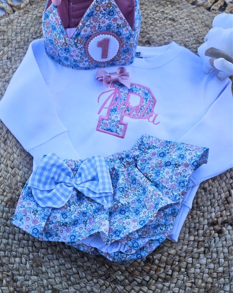 El Conjunto de Cumpleaños Florecillas incluye una preciosa camiseta personalizada con el nombre y la edad de la niña, una corona de cumpleaños a juego con motivos florales y un cubrepañal con volantes confeccionado en telas suaves y coloridas. Todo el conjunto está elaborado de forma artesanal, con tejidos de alta calidad que garantizan comodidad, resistencia y un acabado cuidado hasta el último detalle 🧵✨.