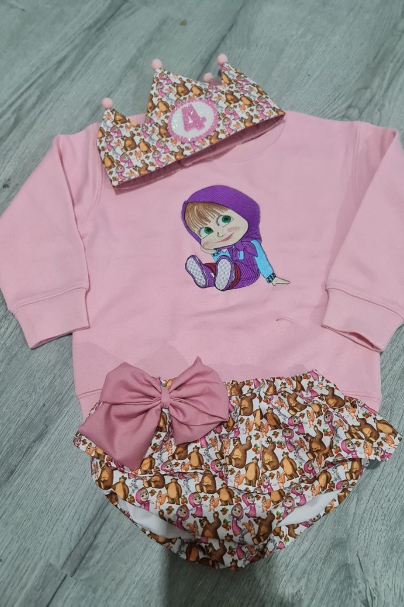 Conjunto de cumpleaños Masha y el oso. Os presentamos este nuevo conjunto de cumpleaños de los dibujo animado de Masha y el oso, compuesto con corona de cumpleaños, sudadera rosa Masha y cubrepañal con volantes. Personalízalo con el nombre y los añitos que cumple.