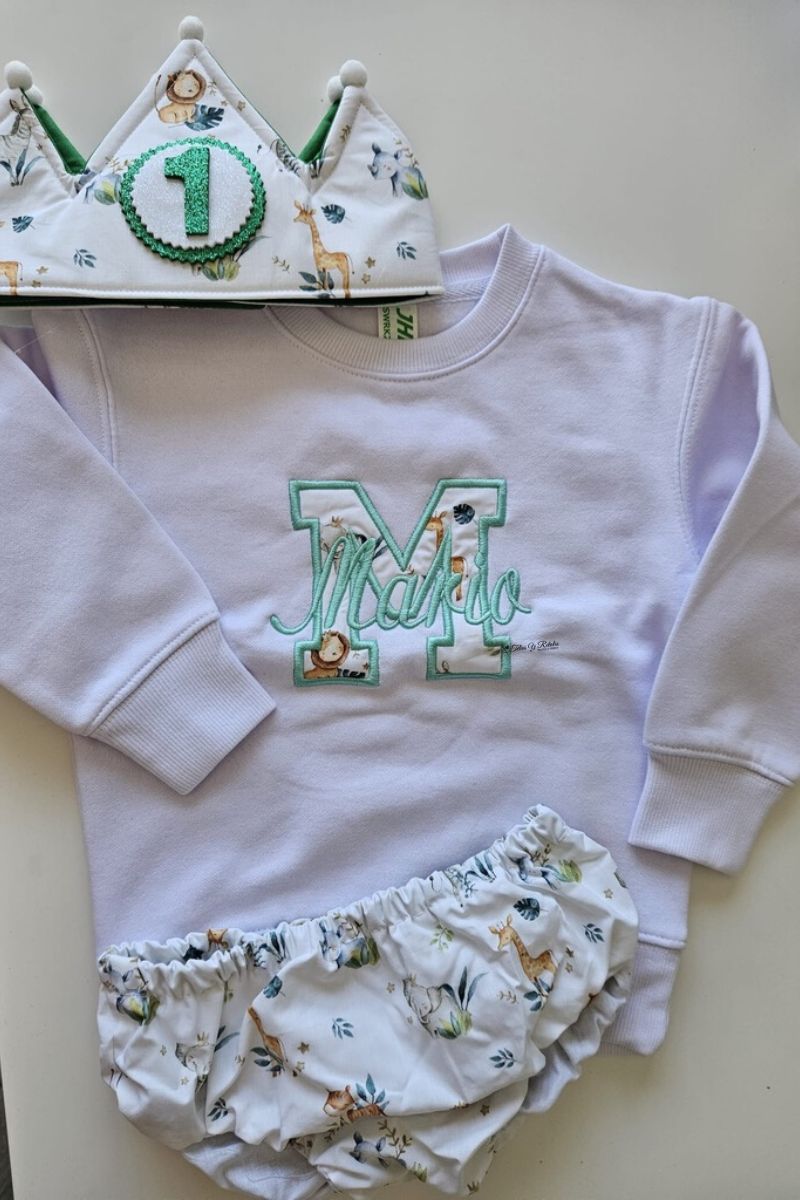 Conjunto de cumpleaños de sudadera blanca con inicial y nombre a conjunto con el cubre pañal de animalitos. ¡Súper bonito!. Os presentamos este nuevo conjunto de cumpleaños compuesto con corona de cumpleaños, sudadera y cubrepañal de tela exclusiva de Telas y Retales. Personalízalo con el nombre, la inicial y los añitos que cumple tu peque.