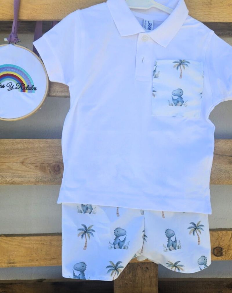 En www.telasyretales.com te presentamos uno de nuestros conjuntos estrella para esta temporada: el conjunto de polito de mangas cortas con short diseño dinosaurio. Perfecto para los pequeños aventureros que adoran a los dinosaurios, este conjunto combina estilo y comodidad en una prenda hecha a mano con mucho mimo.
