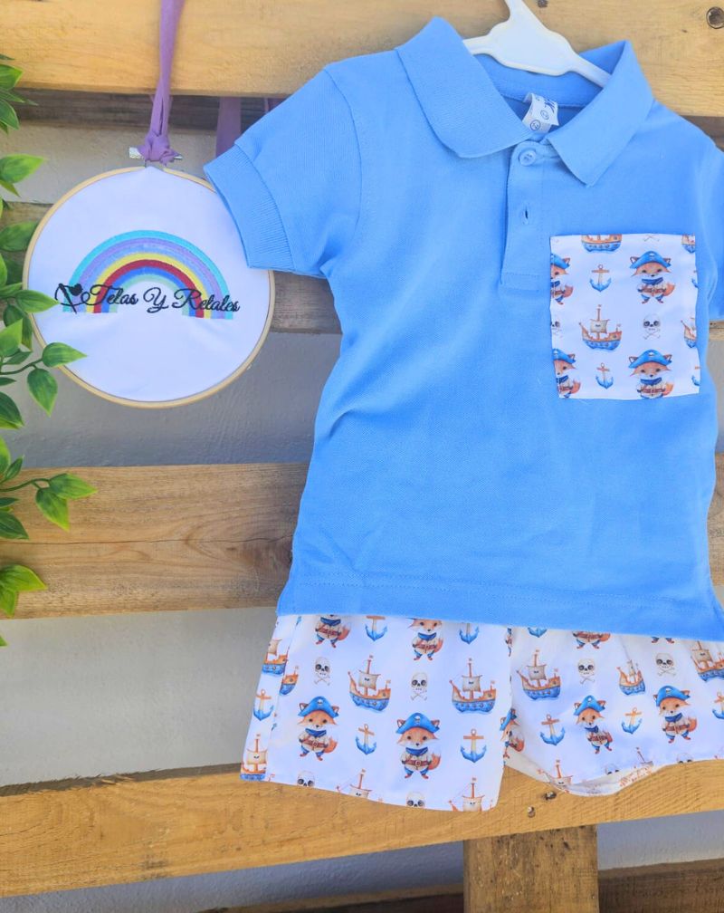 Descubre el adorable conjunto de polito de mangas cortas con short diseño zorro pirata de www.telasyretales.com 🦊🏴☠️. Perfecto para los días de calor, este conjunto hecho a mano combina un polito cómodo y elegante con un short de cintura elástica decorado con divertidos zorros piratas. Ideal para paseos, celebraciones y momentos especiales. Está confeccionado artesanalmente tras la confirmación del pedido, con un plazo de entrega de 10 a 15 días hábiles más 48–72 horas de envío. Moda infantil única, cómoda y llena de encanto, con envíos a toda la península. ¡Haz tu pedido y viste a tu peque con estilo y originalidad! 💙🧵