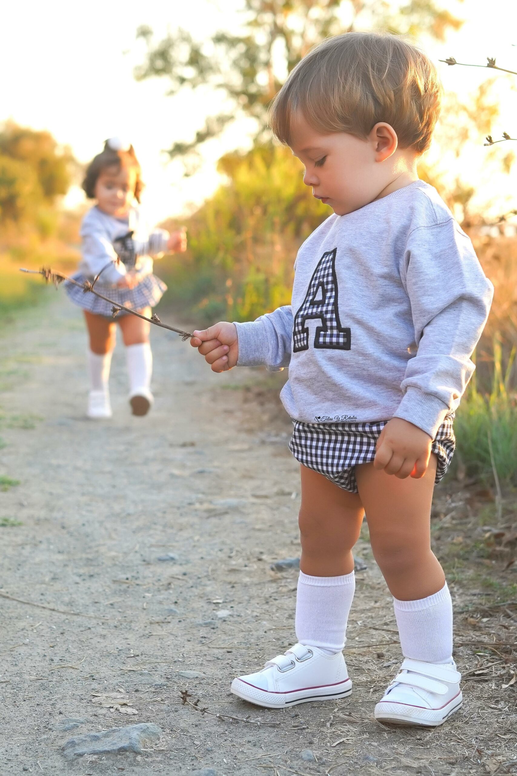 El conjunto incluye una sudadera suave y cómoda con una inicial de tela de cuadros vichy negro, perfecta para mantener a los más pequeños abrigados en días frescos. Su diseño versátil permite combinarlo fácilmente con otras prendas, siendo ideal para cualquier ocasión, desde paseos familiares hasta reuniones casuales. Además, el cubrepañal de cuadros vichy negro complementa el conjunto de manera elegante y práctica, brindando libertad de movimiento y un ajuste perfecto gracias a su confección en tela de alta calidad.