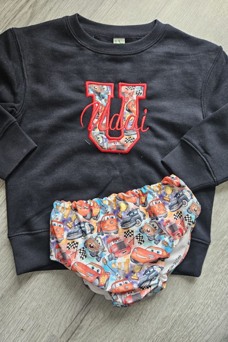 Conjunto de sudadera con inicial y nombre y cubrepañal de Cars