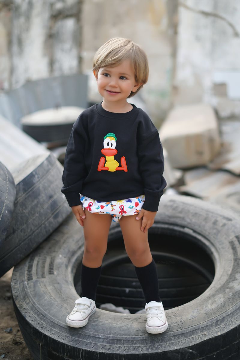 ¿Sabéis quien es Pato? Pato el es amigo de Pocoyó. ¿Qué os parece este conjunto? Formado por sudadera y cubrepañal con nuestras telas exclusivas de Telas y Retales.