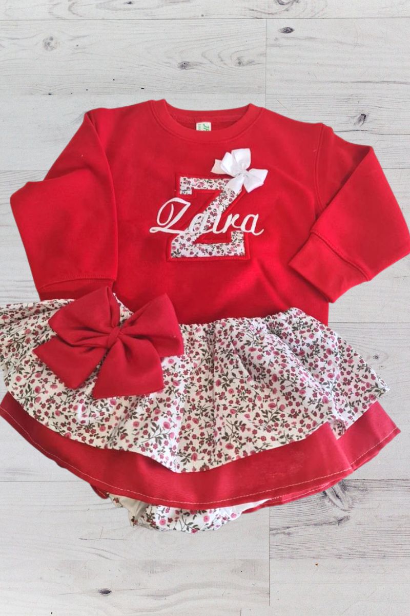 InicioTiendaConjuntosConjunto rojo con nombre e inicial estampado florecillas