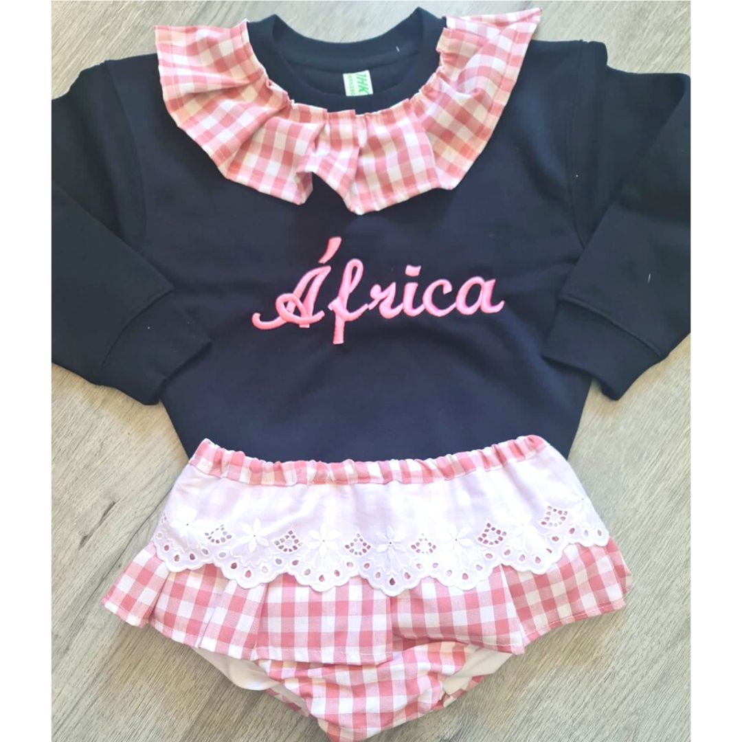 Conjunto de sudadera con nombre bordado y cubrefalda a conjunto de tela de cuadros vichy en rosa. Elige la talla correcta y la inicial y al carrito. Además puedes añadirle cuello y lazo.