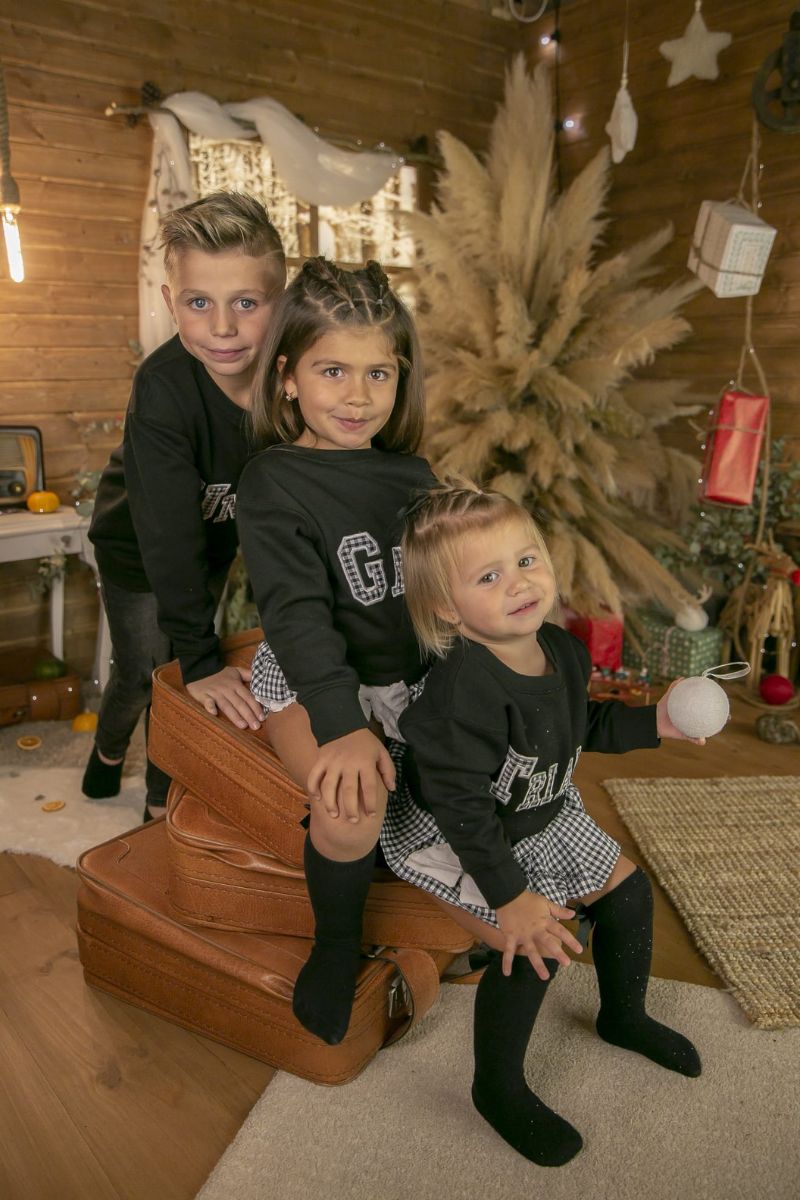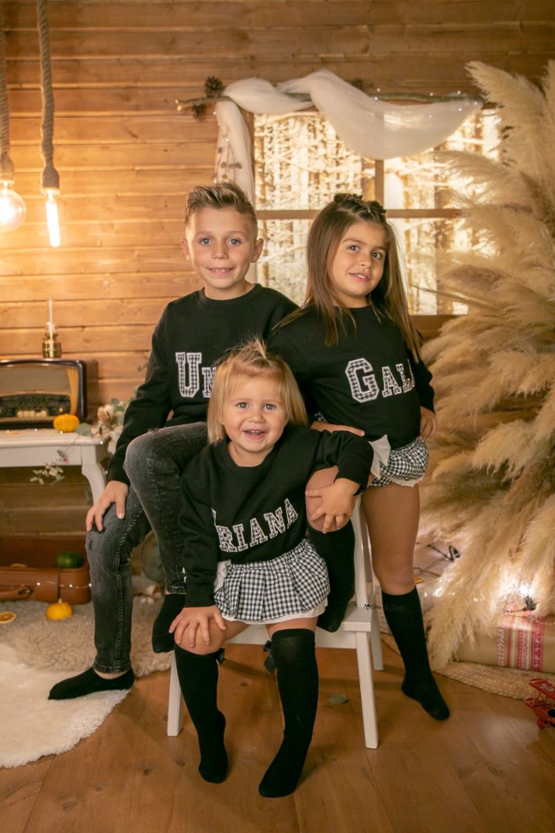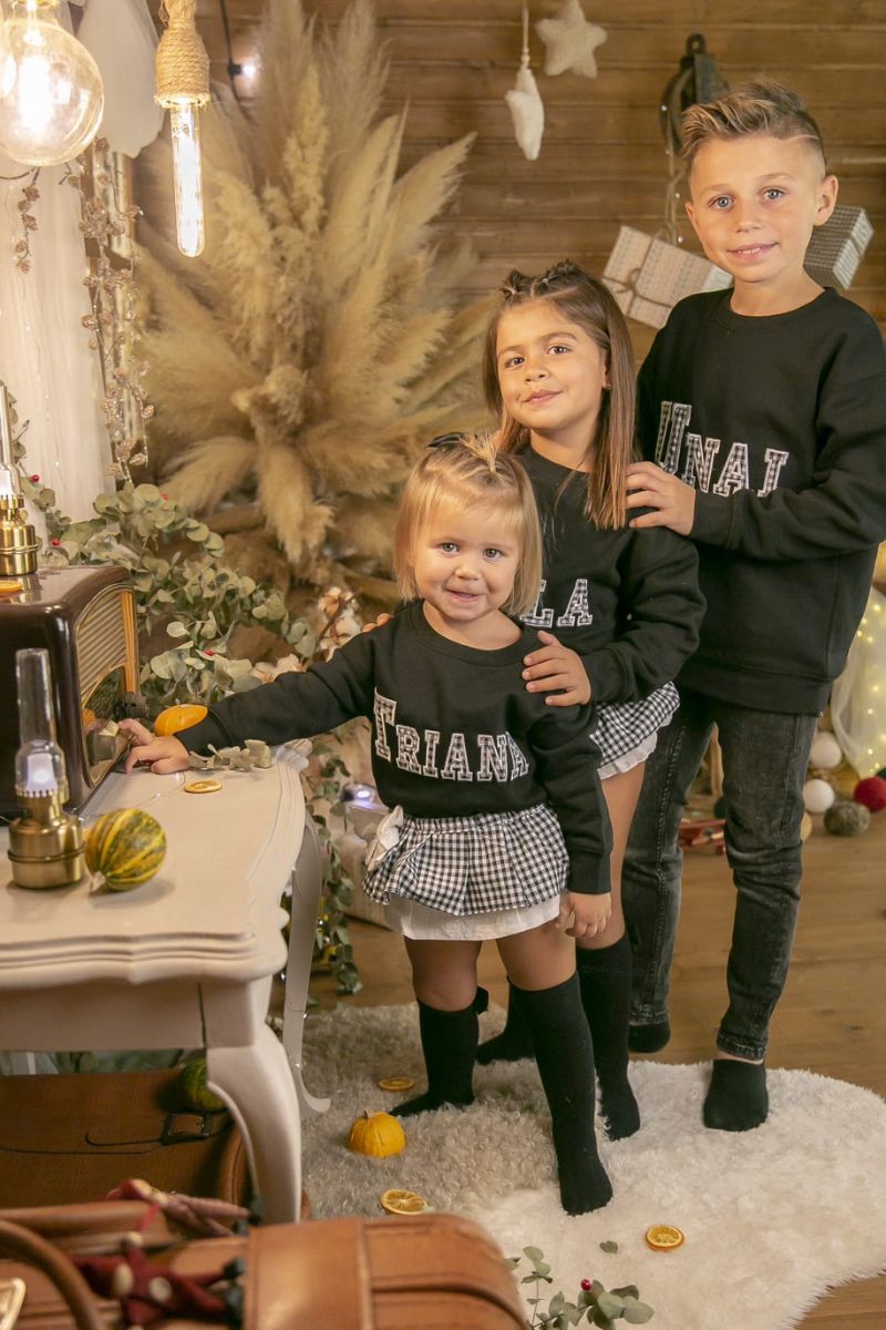 Nuevo conjunto de sudadera de color negro con el nombre de tu peque en tela de cuadro vichy negro y cubrefalda con volante de tela de cuadro vichy negro a conjunto. Prendas ideales para hermanos.