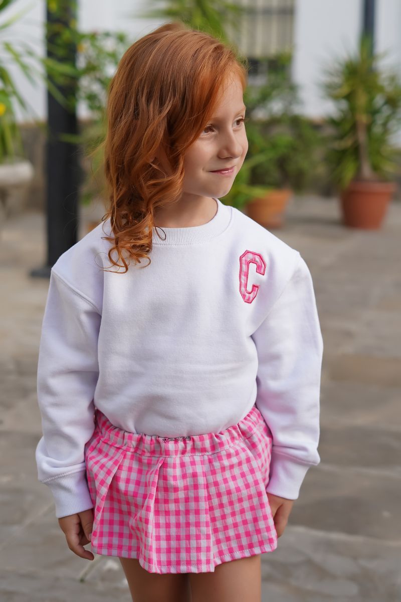 Conjunto sudadera personalizada con inicial y cubrefalda de cuadros vichy rosa
