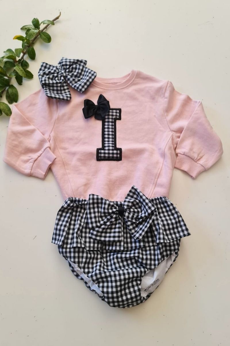 Conjunto sudadera rosa y cubrefalda de cuadros vichy negro