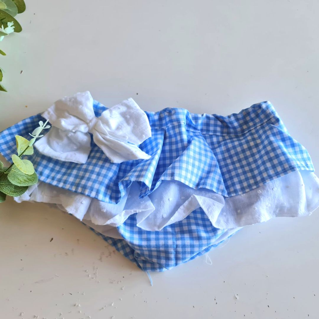 InicioTiendaCubrefaldasCubrefalda con volante de cuadros vichy celeste con lazos blancos