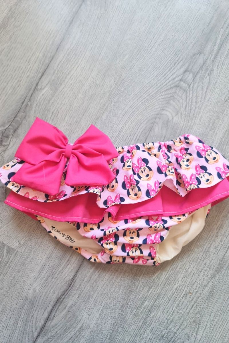 Cubrefalda con volante con telas exclusivas de Telas y Retales. Este cubrefalda cuenta con la tela de Minnie con volante y lazo de tela de color rosa fucsia liso. Elige la talla perfecta para tu peque.