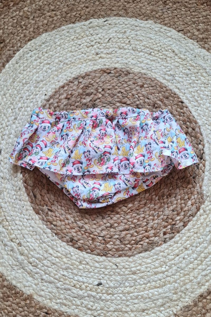 • Cubrefalda con volante de Mickey y Minnie amorosos con lazo fucsia